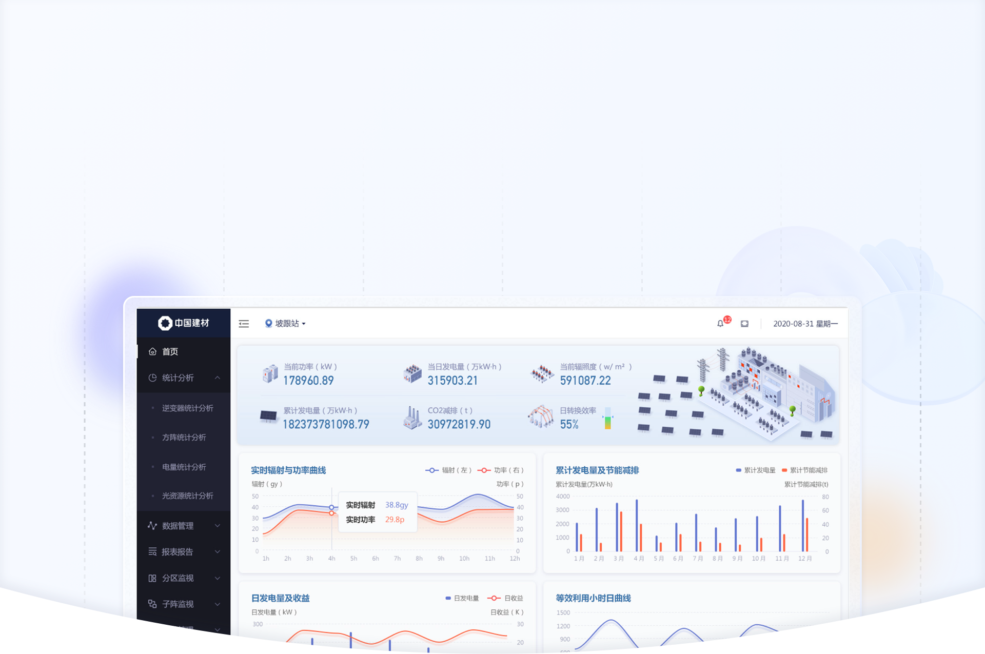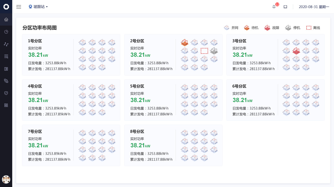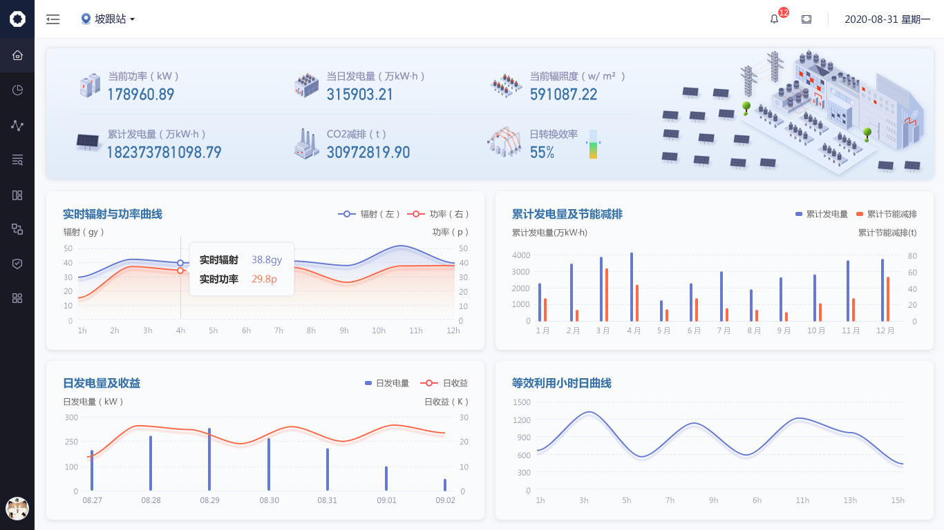 針對數(shù)據(jù)信息發(fā)生的變化,我們使用“場景化設(shè)計(jì)原則“,用立體圖標(biāo)方式繪制出從”光伏板-逆變器-交流匯流箱“發(fā)電原理圖,把數(shù)據(jù)展示在對應(yīng)的環(huán)節(jié)中,形成可視化的實(shí)時(shí)監(jiān)控圖譜。;其余與發(fā)電流程無關(guān)的數(shù)據(jù)也均以圖標(biāo)+文字的形式展示頁頁面右側(cè)。