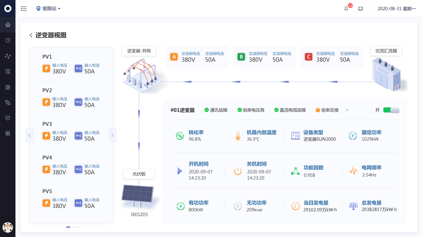 逆變器視圖界面需求變更比較大,圍繞逆變器這一核心部件,增加很多前后環(huán)節(jié)中實(shí)時(shí)數(shù)據(jù)信息,但展示本質(zhì)并未發(fā)生變化。