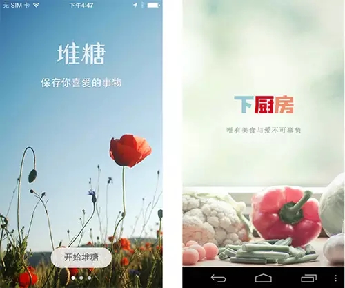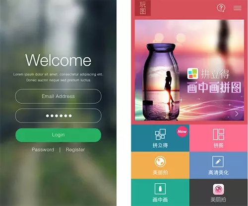 下面的左圖是一個注冊頁面,btn采用了中軸型的構(gòu)圖,清晰地展現(xiàn)了操作項(xiàng)和注冊流程。右圖采用了上下分割的版面構(gòu)成,上面為圖片展示,下面部分為選項(xiàng)和操作,結(jié)構(gòu)非常清晰。