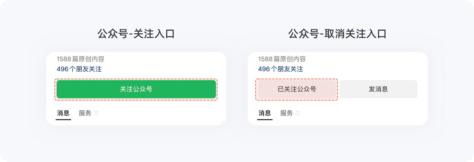 有時候,出于商業(yè)化的目的,同一個選項在二次操作時,產(chǎn)品會刻意增加用戶操作成本,以降低選擇效率,看似??硕傻姆聪虿僮?,卻一定程度地降低了用戶退出率,實則對產(chǎn)品有益。例如,在關注微信公眾號之前,非常醒目的關注按鈕觸手可及,可關注之后,弱化的幽靈按鈕及文案,很難一眼看出這就是取消關注入口,需要用戶花費額外的時間去理解或試錯方可取關,這么做能降低公眾號粉絲的取關量。為公眾號留住粉絲,更是對內(nèi)容認可的一種支持,后面的良性循環(huán)無需多講。