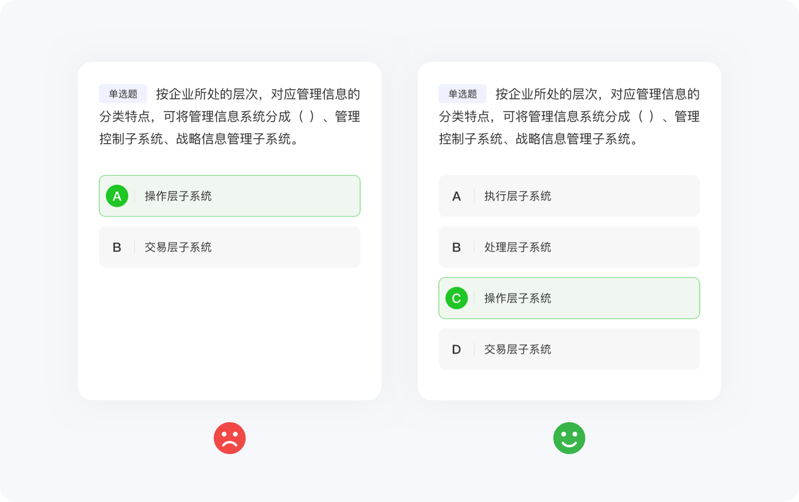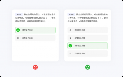 任何定律都有其自身的使用局限,所以也不要極度推崇??硕啥喕匠橄蟮牡夭健4蟛糠智闆r下,希克定律都是用在可交互界面中的元素,對于那些需要高度搜索、閱讀或學習刷題類的功能并不適用,因為設計師只能決定信息呈現(xiàn)的視覺效果,并不能決定內(nèi)容的質量、類型與數(shù)量。例如,刷題類應用,面對海量的選擇題,??硕呻m然失去價值,但并不影響設計師結合其他方法論將界面設計的更好,總不能強行使用希克定律,將選擇題刪減到只剩兩個(變成判斷題)選項吧。