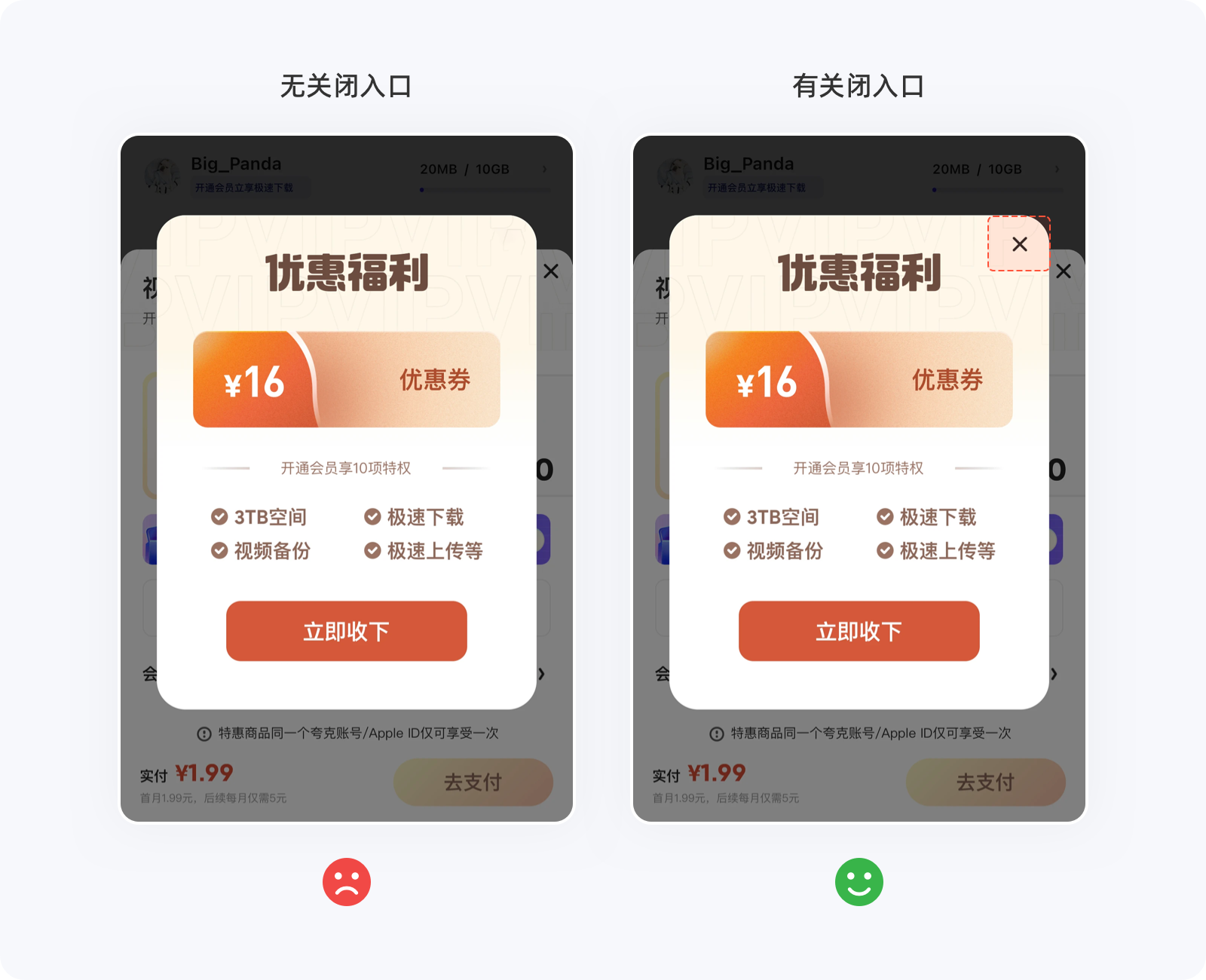 彈窗最主要的功能就是服務于當前主任務之外的支線任務,包括信息傳遞,操作反饋等。對話框,警告框,toast......都屬于彈窗,但是使用場景都不一樣。在合適的業(yè)務場景選擇合適的彈窗組件,能夠保證最基礎的用戶體驗。因為像強干擾類彈窗的使用,對用戶而言,更是一種強加的任務,很容易導致用戶喪失耐心而流失