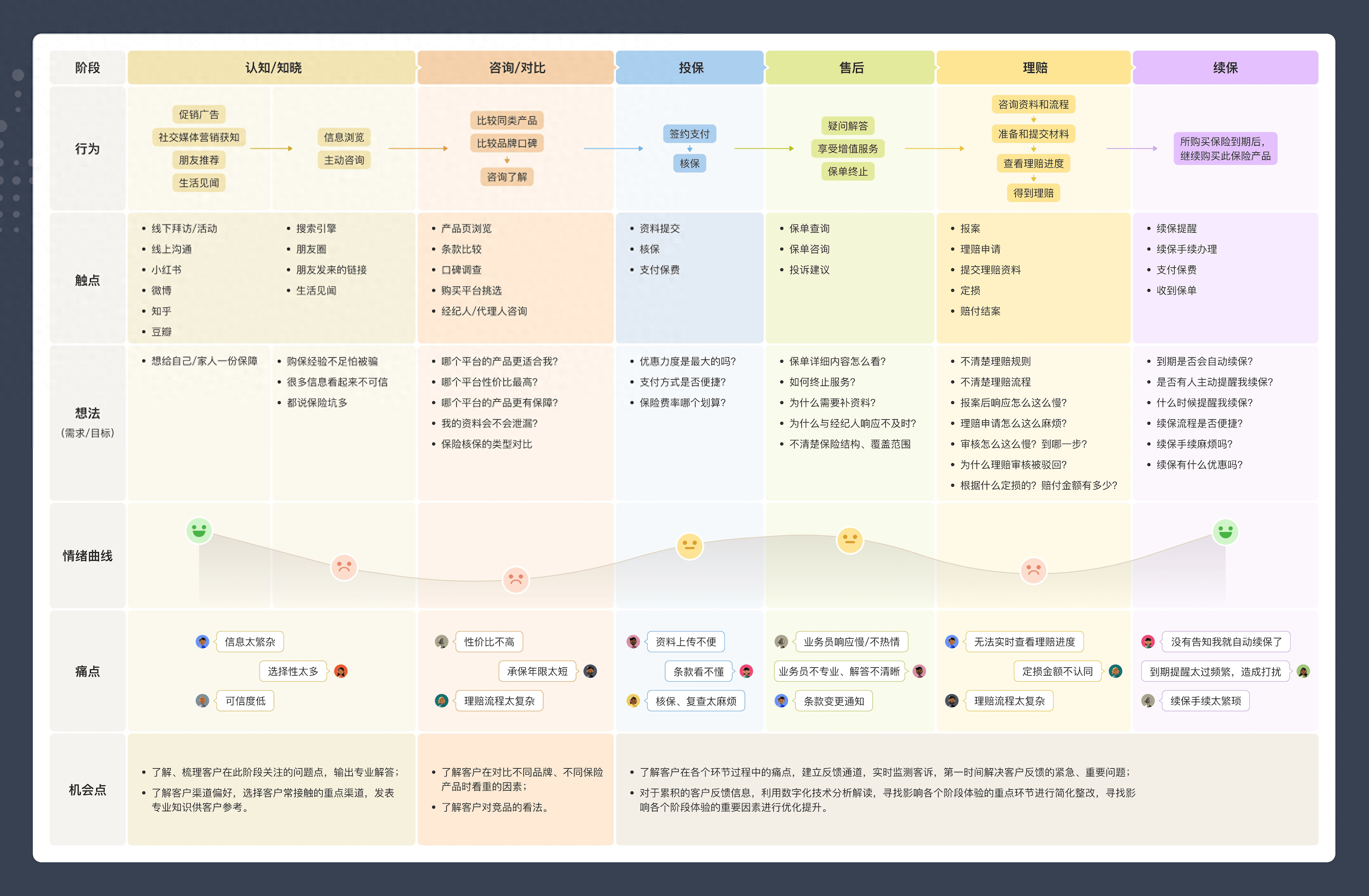 根據(jù)目標用戶的任務和行為,我們可以梳理出該場景下用戶的行為流程。這個流程包括用戶需要經(jīng)歷的階段、環(huán)節(jié)以及交互方式等。如果涉及主次任務流程,都需要一一梳理出來,并加以歸類。這個過程需要深入的剖析,盡可能找出所有用戶與軟件產(chǎn)品產(chǎn)生交互的接觸點,以便進一步拆分出每個階段的用戶目標、操作、接觸點位置、用戶想法以及用戶感受。