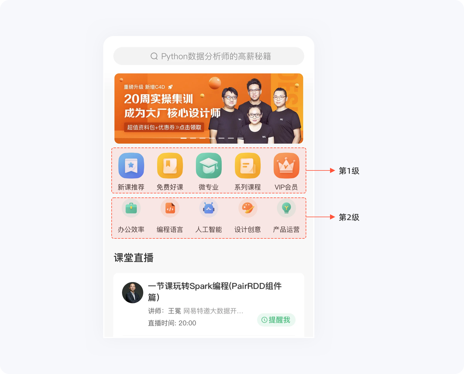 在設計過程中,如果沒有對功能層級進行劃分,一股腦地將所有功能入口平鋪的話,就需要用戶花費大量的時間和精力來查找需要的功能,無疑是一場災難。我們可以通過??硕蓙韮?yōu)化界面功能布局,根據(jù)業(yè)務的重要性對功能入口進行分類組合,減少用戶的認知及理解成本,以便快速達到目的。