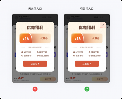 ??硕梢龅氖峭ㄟ^減少用戶做決定的時間,來提升轉化率以及用戶體驗,但不管在什么情況下,用戶都希望自己還擁有選擇的權利,如果設計師自作聰明的將選項減到只剩一個,就相當于告知用戶必須接受,那么用戶就有種被強制、綁架的感覺,只會存在兩個結果:①被你的產(chǎn)品拿捏、②離開你的產(chǎn)品,筆者相信第一種可能性的概率極低,畢竟同類型的產(chǎn)品并不是只有你一家(壟斷除外)。如下圖的彈窗,用戶即便不愿意進入任務流程,可別無選擇,只能進入后再返回才能回到原位,這種做法無端增加用戶的操作成本,極易引起反感情緒。不管產(chǎn)品如何希望用戶轉化,切不可強制他們接受,需要給用戶留一條返回的“路”,即便不那么起眼,至少還有選擇的權利。
