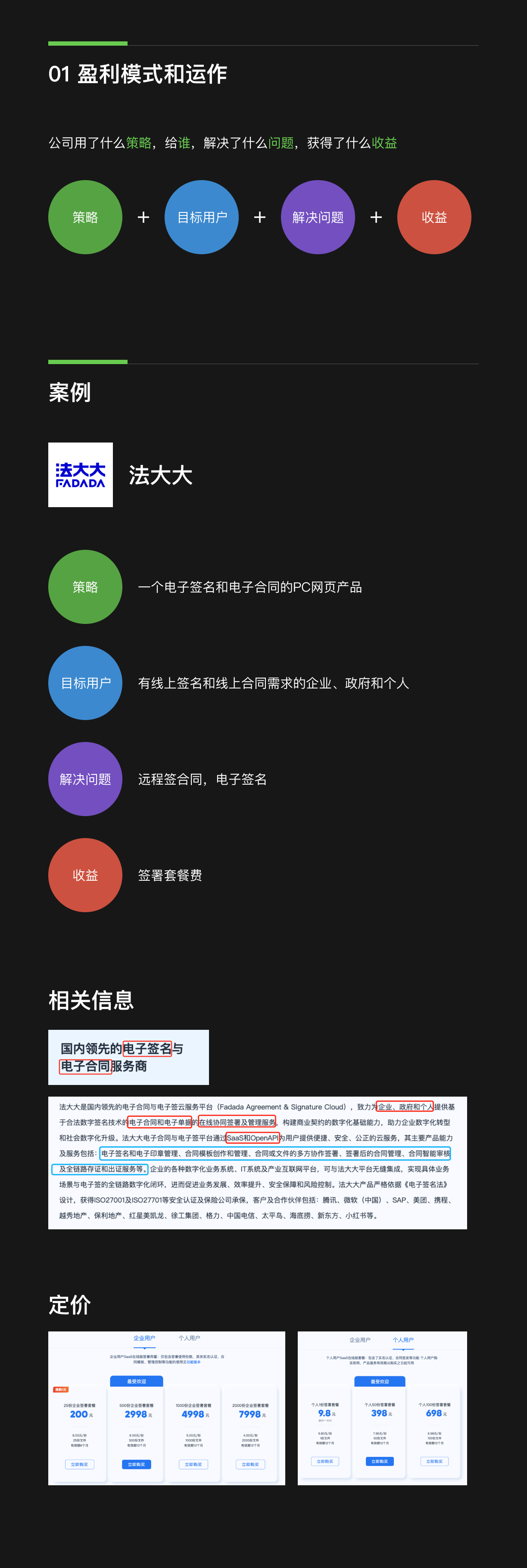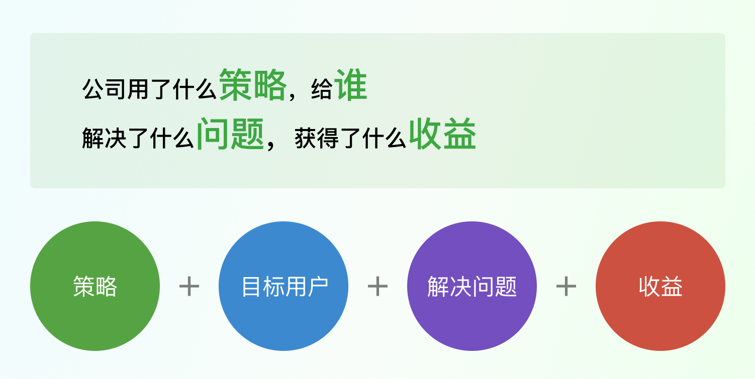 到此先做個(gè)小結(jié):① 了解公司盈利和運(yùn)作的公式:公司用了什么策略,給誰(shuí),解決了什么問(wèn)題,獲得了什么收益