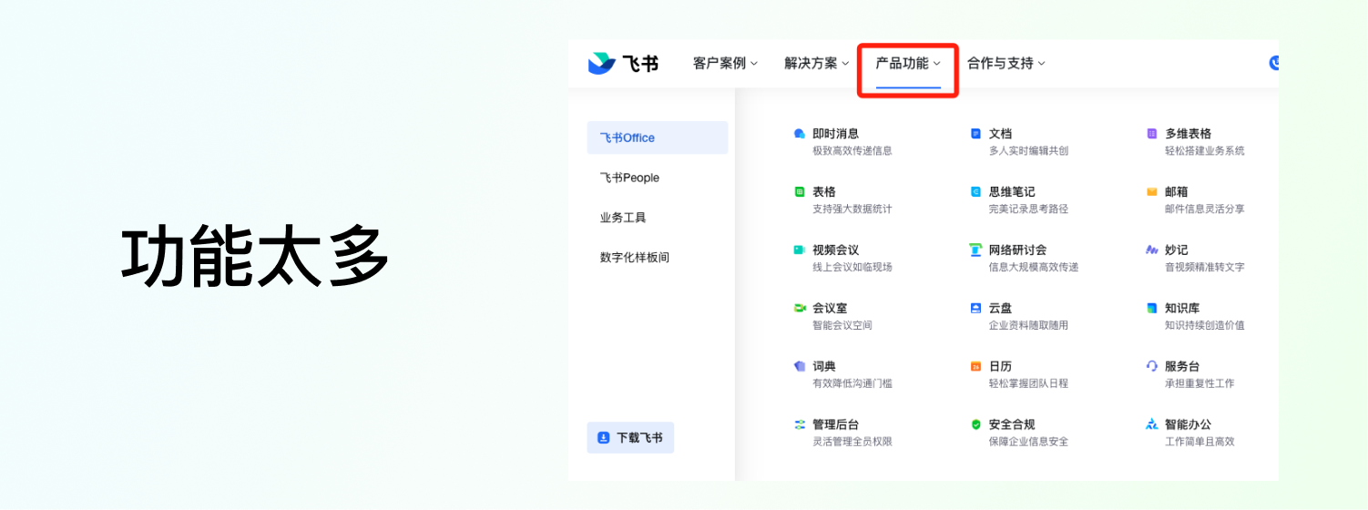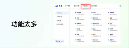 去哪里了解呢?一般企業(yè)官網(wǎng)都會(huì)把自家產(chǎn)品列出來(lái),方便客戶查看,咱們也可以順著這條路線去走。就拿飛書舉例,從導(dǎo)航欄的“產(chǎn)品功能”我們可以看到,主要是四條線,咱們不用把每條線都挖得很細(xì)致,但是起碼要有大概的認(rèn)知,知道這是個(gè)什么東西,做什么的,最好上手體驗(yàn)體驗(yàn)。