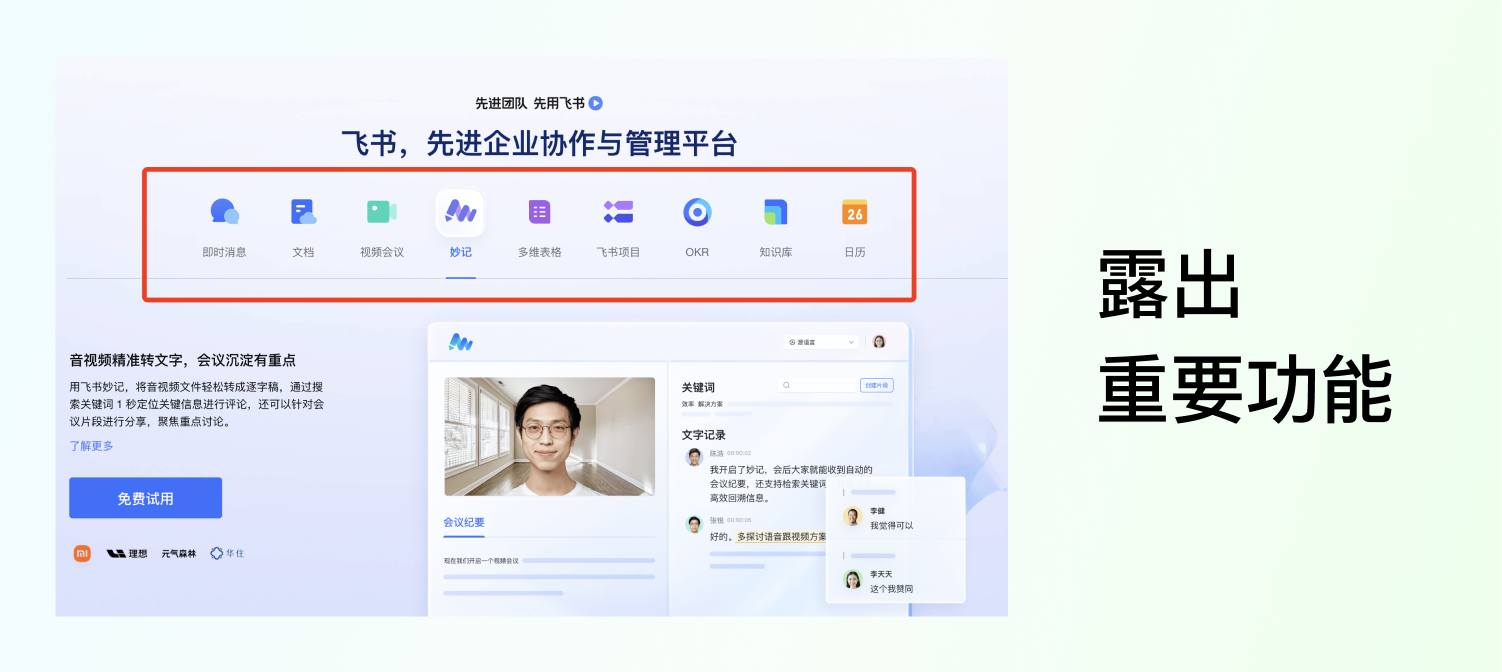 例如飛書在未登錄用戶的首頁(yè)黃金位置,把重點(diǎn)功能單獨(dú)強(qiáng)調(diào),在登錄用戶的導(dǎo)航欄和頭部的位置都做了這些功能的露出。反復(fù)強(qiáng)調(diào)和露出,重要程度不用我多說(shuō)了吧。