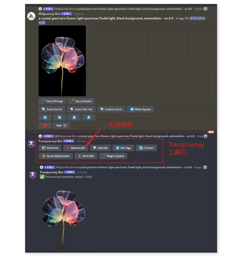 Tracejourney 是一款基于 Discord 的圖像處理工具,功能包括摳圖、圖像轉(zhuǎn) SVG、放大、提取描述詞、格式轉(zhuǎn)換以及亮度和對(duì)比度調(diào)節(jié),將圖片直接發(fā)送 Tracejourney bot,在彈出的工具欄內(nèi)點(diǎn)擊對(duì)應(yīng)的按鈕就可以了。