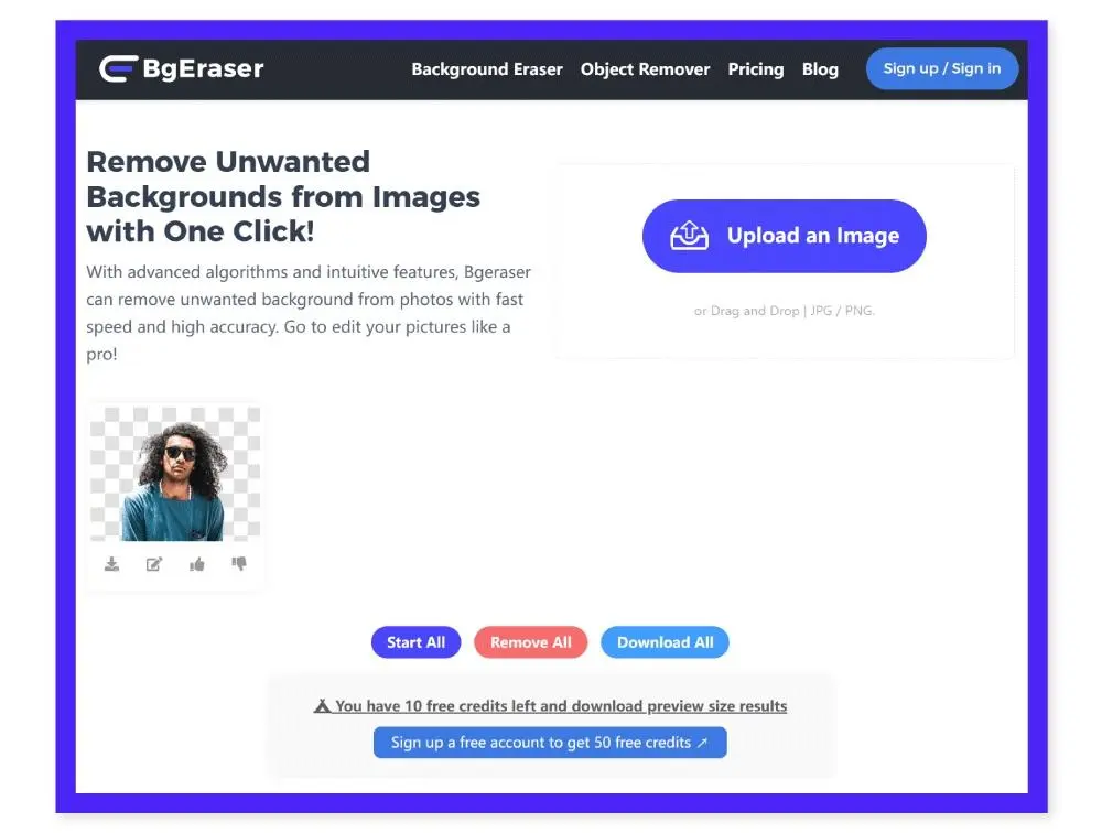 一個(gè)專注于 AI 摳圖網(wǎng)站,支持批量處理。上傳圖像后點(diǎn)擊 start 開(kāi)始處理圖像,摳圖時(shí)間在 30s 左右。新用戶有 10 次的免費(fèi)摳圖額度,注冊(cè)登錄后額度可以上升至 50 次。