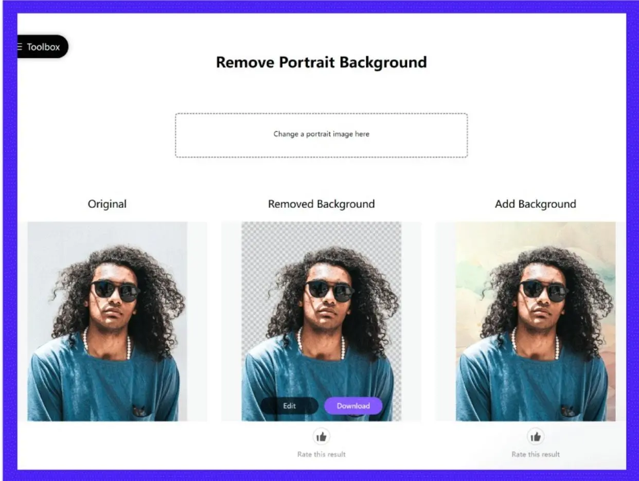 Toolkit 是一個(gè)多功能的圖片處理網(wǎng)站,其中就包括一鍵人像摳圖的功能。同樣是免費(fèi)使用,無(wú)需登錄注冊(cè)。進(jìn)入網(wǎng)頁(yè)后,上傳本地圖像網(wǎng)頁(yè)就會(huì)開(kāi)始自動(dòng)處理,支持為摳圖后的人像添加自定義背景。
