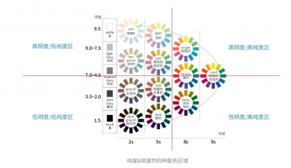 明度與純度聯(lián)系在一起研究,我們可以將其分為 4 種配色類型,分別是高明度/高純度、高明度/低純度、低明度/高純度、低明度/低純度。