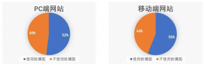 在美國(guó)一份針對(duì) 50 家頂級(jí)零售電商網(wǎng)站的統(tǒng)計(jì)中,發(fā)現(xiàn)輪播圖被廣泛運(yùn)用于電商網(wǎng)站:PC 端 52%的電商網(wǎng)站使用輪播圖,而與此同時(shí)移動(dòng)端 56%的電商網(wǎng)站使用輪播圖。(以下圖表是譯者個(gè)人為方便大家理解制作的)