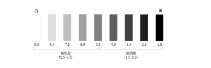 CCS 色彩體系將明度分為 17 級(jí),每 0.5 級(jí)為一個(gè)階梯。為了方便理解,我們也可以粗略地分為 9 級(jí),黑為 1.5,白為 9.5;以 5.5 級(jí)灰為中間點(diǎn),1.5~5.5 為低明度,5.5~9.5 為高明度。明度差越大顏色對(duì)比越明顯,明度差越小則對(duì)比越弱。
