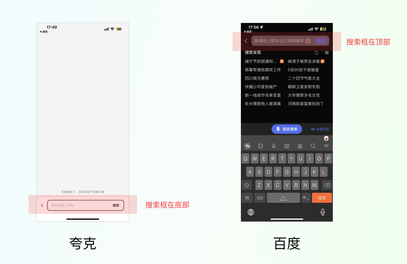 因?yàn)榭淇讼胪品瓊鹘y(tǒng)的瀏覽器,想打造一款更年輕更好用的瀏覽器,把搜索框放到下面也是滿足他們的業(yè)務(wù)訴求,現(xiàn)在手機(jī)屏幕越來越大,搜索框放在下面手指操作更加方便。所以,一定要先去了解業(yè)務(wù)。