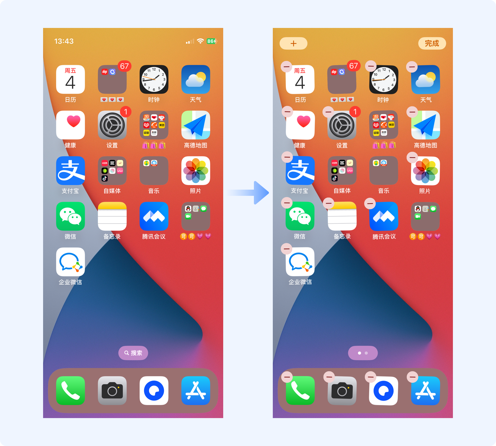 移動(dòng)端產(chǎn)品中有很多這樣的案例,如iOS系統(tǒng)中,長(zhǎng)按刪除某個(gè)APP時(shí),所有桌面圖標(biāo)會(huì)抖動(dòng)、且左上角都有一個(gè)相同的刪除圖標(biāo),通過(guò)一致性的動(dòng)作告知用戶圖標(biāo)的可操作狀態(tài),非常直觀。