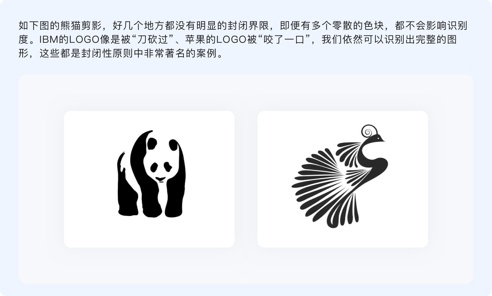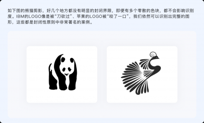 封閉性原則指出,人們的視覺(jué)系統(tǒng)傾向于將不完整的局部當(dāng)做一個(gè)整體來(lái)感知??雌饋?lái)與連續(xù)性有諸多相似,不過(guò)連續(xù)性是通過(guò)物體的形狀和運(yùn)動(dòng)方向、按照視覺(jué)慣性來(lái)制定閉合規(guī)律,而封閉性則并無(wú)特定規(guī)律,只要把握好不完整物體的尺度、使各元素之間相互輔助,就能讓其與我們認(rèn)知模型中的原型匹配。