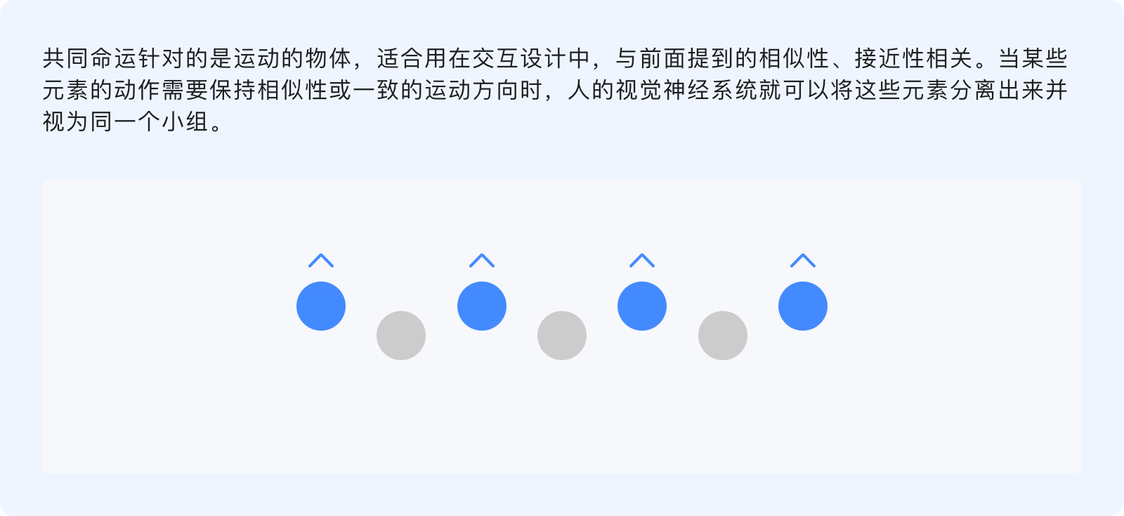 共同命運(yùn)原則指出,人們傾向于將具有共同運(yùn)動(dòng)形式的事物感知為一個(gè)彼此相關(guān)的整體,無(wú)論元素之間的距離有多遠(yuǎn)、或其他屬性(形狀、顏色、大?。└鳟?,但只要沿著相同的方向、相同的速度運(yùn)動(dòng),共同命運(yùn)就會(huì)將其歸類。