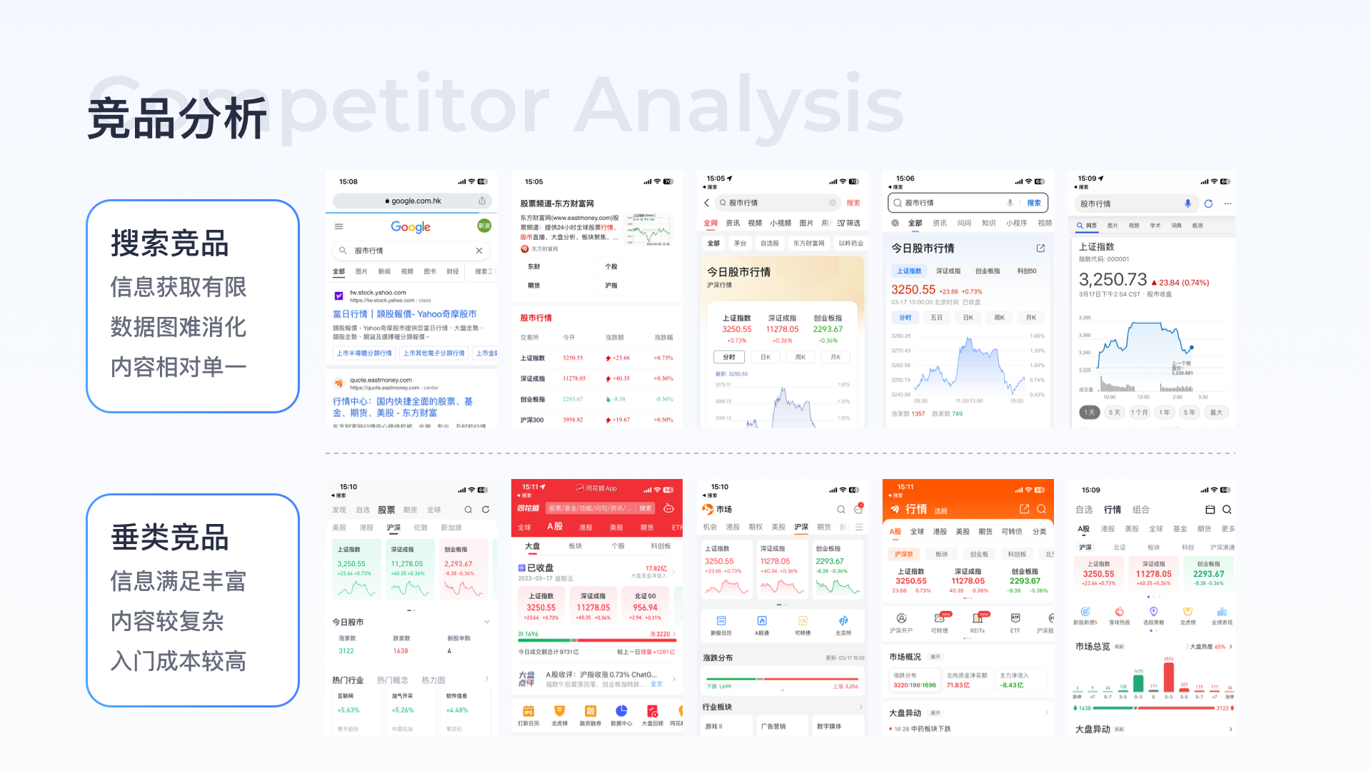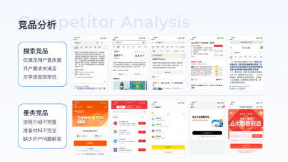 競(jìng)品分析:搜索競(jìng)品包括今日頭條、夸克、QQ瀏覽器、必應(yīng)、谷歌均以滿足用戶查找需求為主,信息以純文本形式展現(xiàn),消費(fèi)成本較高,且未滿足用戶潛在的開(kāi)戶需求,垂類(lèi)競(jìng)品開(kāi)戶頁(yè)對(duì)流程、材料介紹均不完整、缺少完整的介紹及問(wèn)題解答。