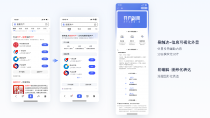 策略設(shè)計(jì) :結(jié)合用戶需求優(yōu)先級(jí)對(duì)信息模塊進(jìn)行分區(qū),可視化外顯優(yōu)先滿足開(kāi)戶流程需求,再提供優(yōu)質(zhì)券商開(kāi)戶入口,考慮到搜索結(jié)果頁(yè)卡片展示屏效,完整開(kāi)戶指南配合在落地頁(yè)內(nèi)呈現(xiàn)。