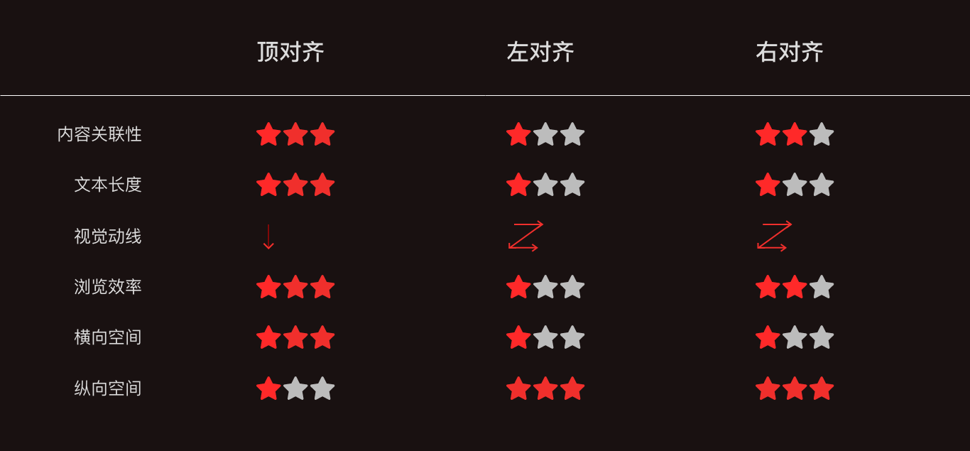 如何去選擇這三種對齊方式呢?我們從內(nèi)容關(guān)聯(lián)性、標(biāo)題長度的靈活性、空間的占比、閱讀體驗等幾個維度進(jìn)行優(yōu)劣分析。