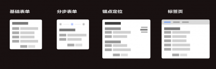 表單在設(shè)計時需要對其進(jìn)行合理的歸納簡化,降低表單填寫負(fù)荷。 通常我們將表單分為基礎(chǔ)表單、分步表單、錨點定位、標(biāo)簽頁這幾類。