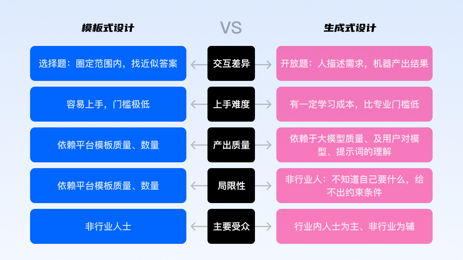 如果不畫圖就快速的產(chǎn)出,模板式設(shè)計與生成式AI出圖是擺在面前的兩種選擇,模板式設(shè)計不算AI,可以當(dāng)做“智能產(chǎn)出”,到底哪個好,核心差異在哪?