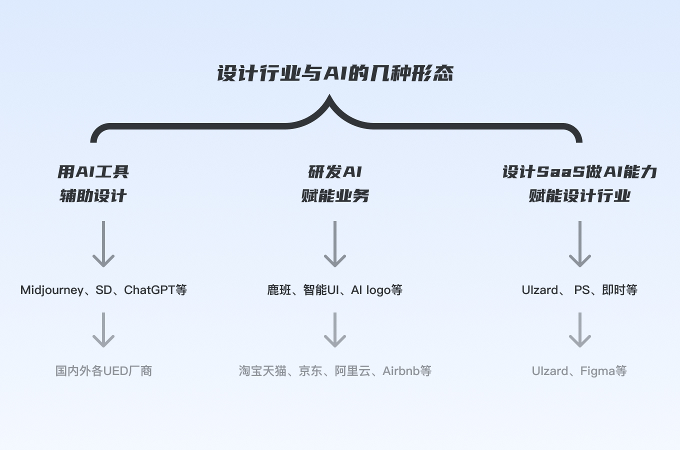 其實目前設(shè)計團(tuán)隊或設(shè)計行業(yè)與AI的關(guān)系,可以歸納為3種形態(tài):
