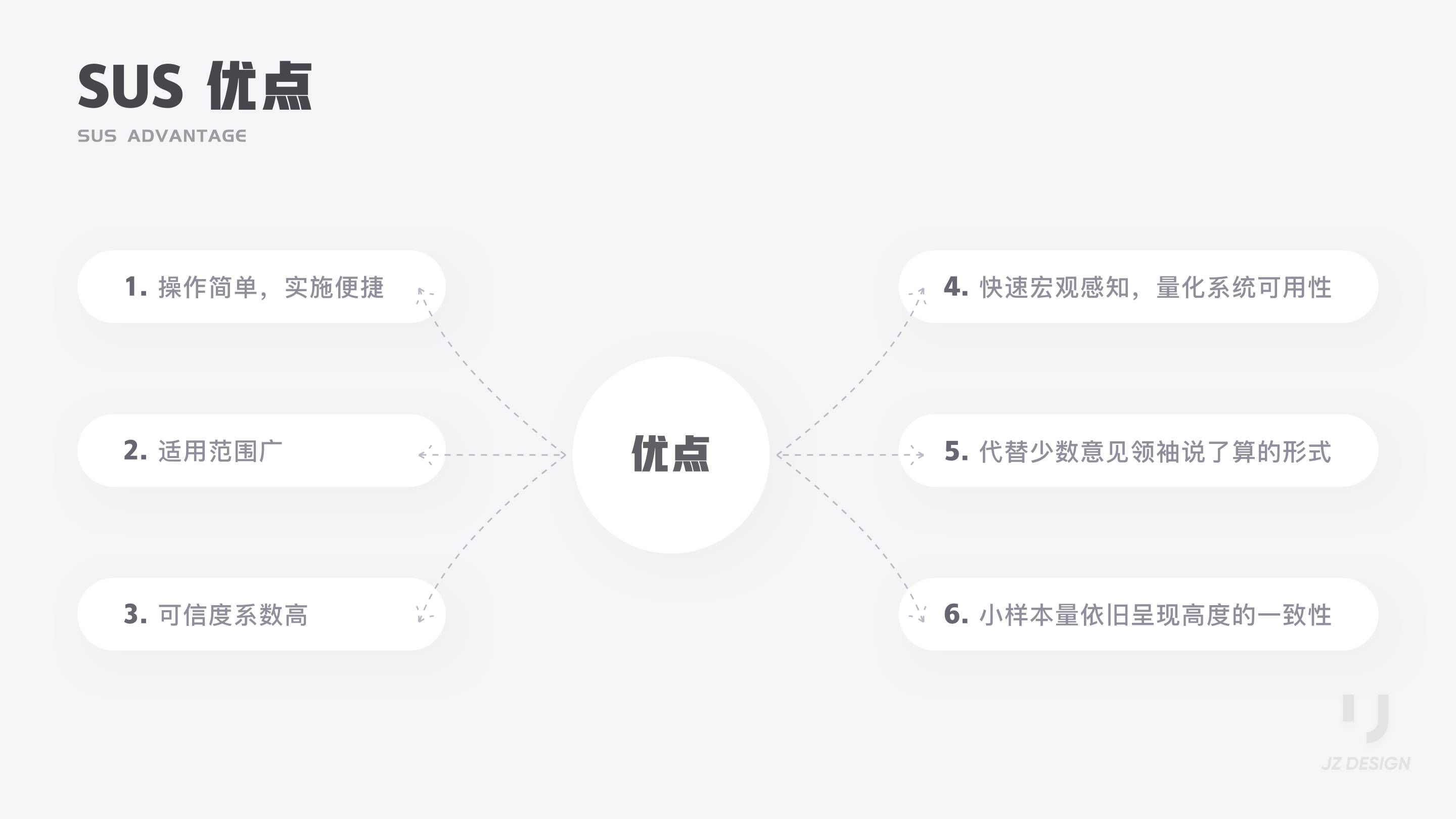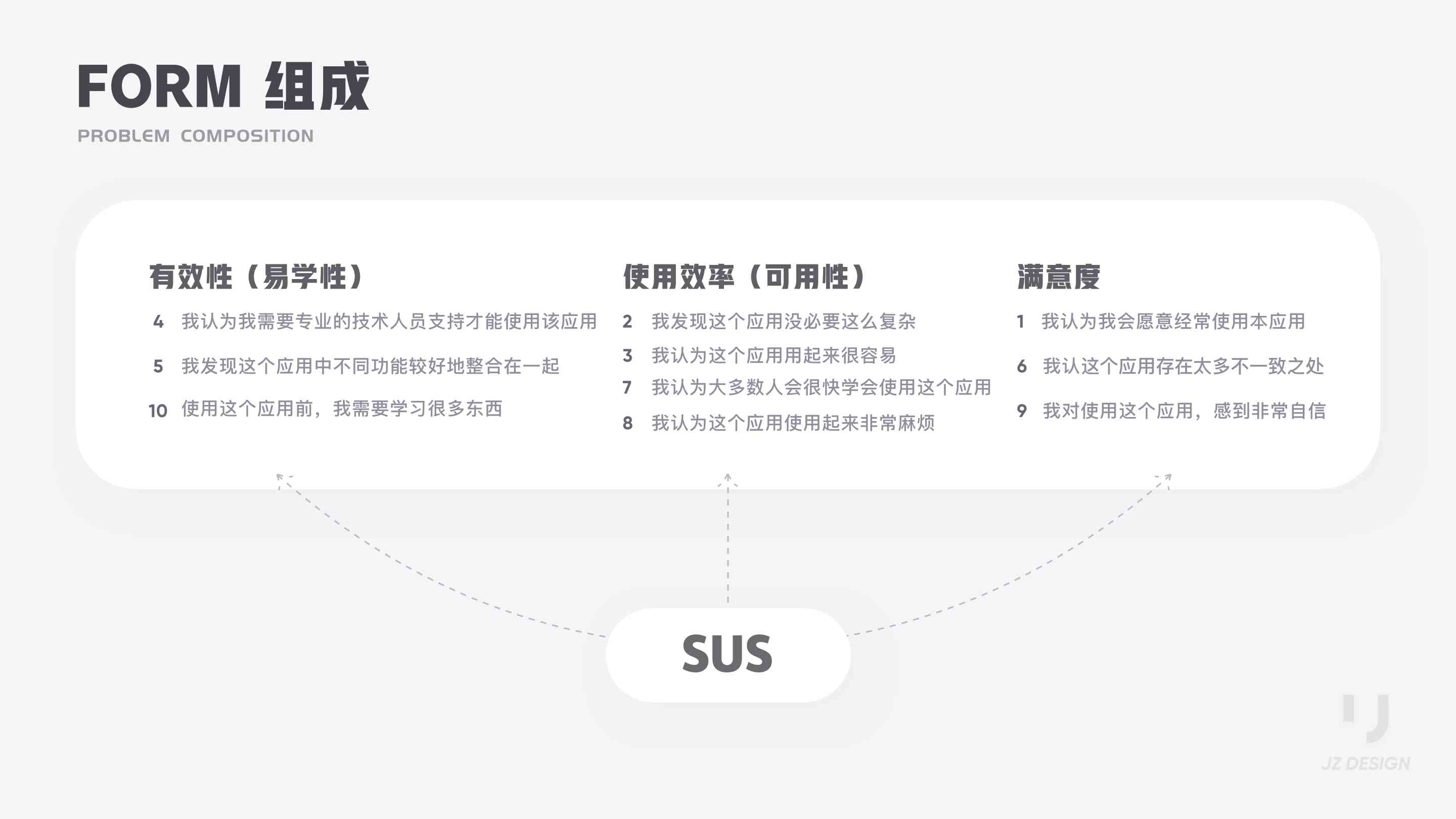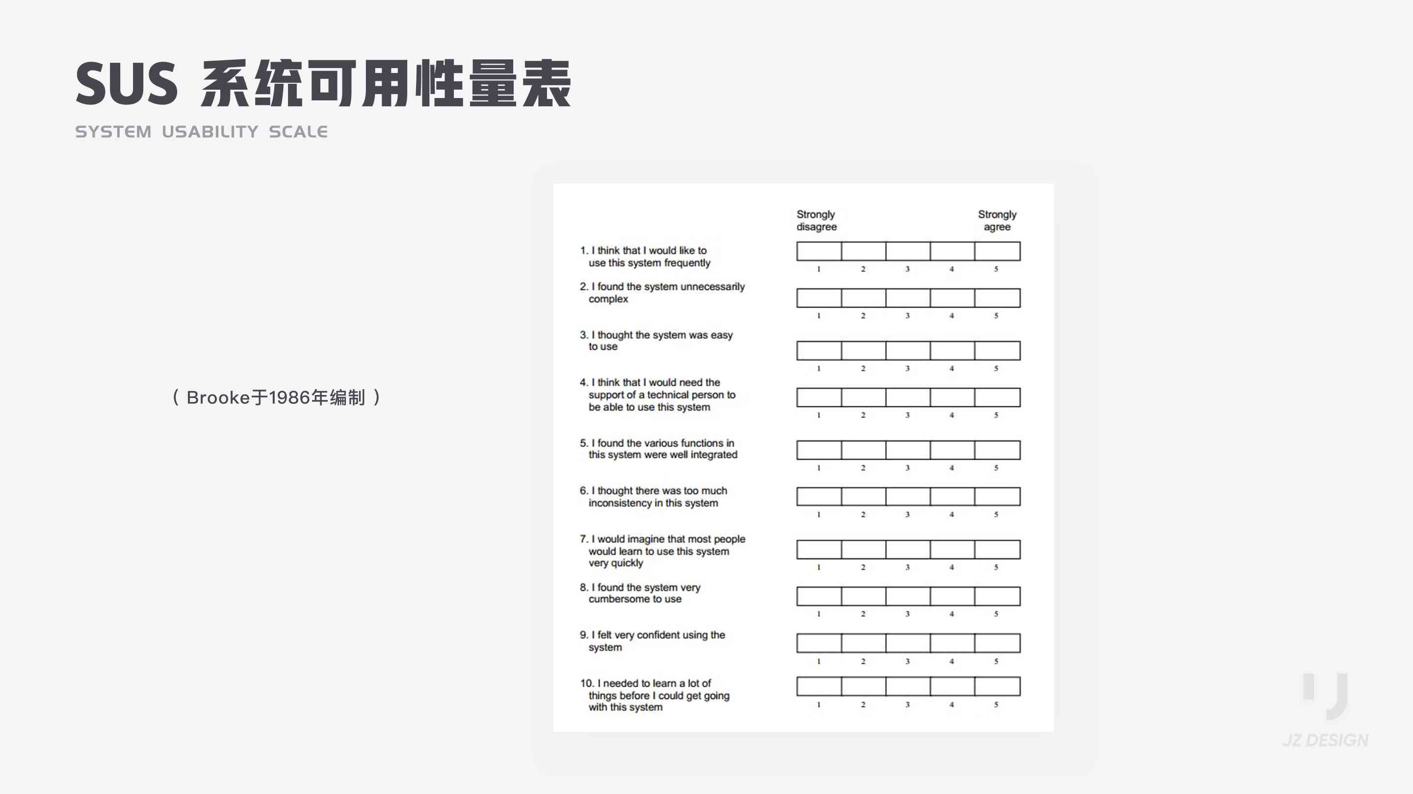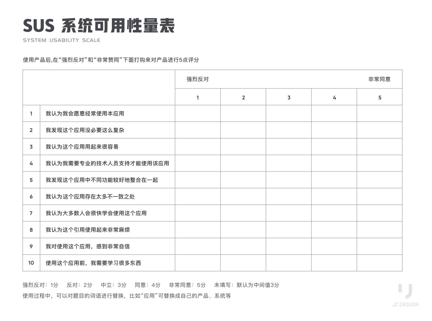 SUS 全稱 System Usability Scale ,系統(tǒng)可用性量表。SUS最初是Brooke于1986年編制,可以科學(xué)地量化用戶體驗(yàn),用于完成一系列任務(wù)場景后,對產(chǎn)品或系統(tǒng)整體宏觀的感知可用性測量。