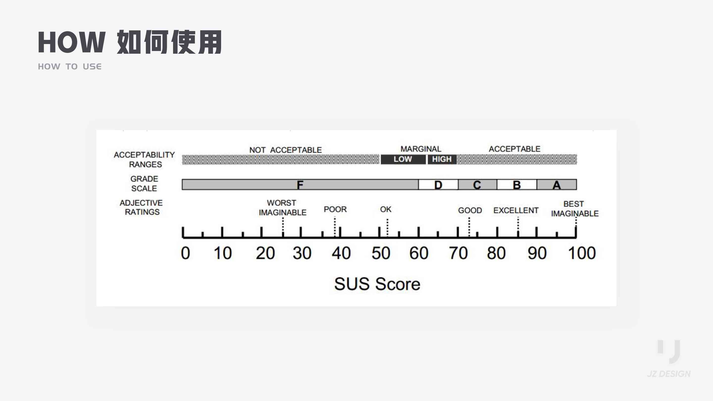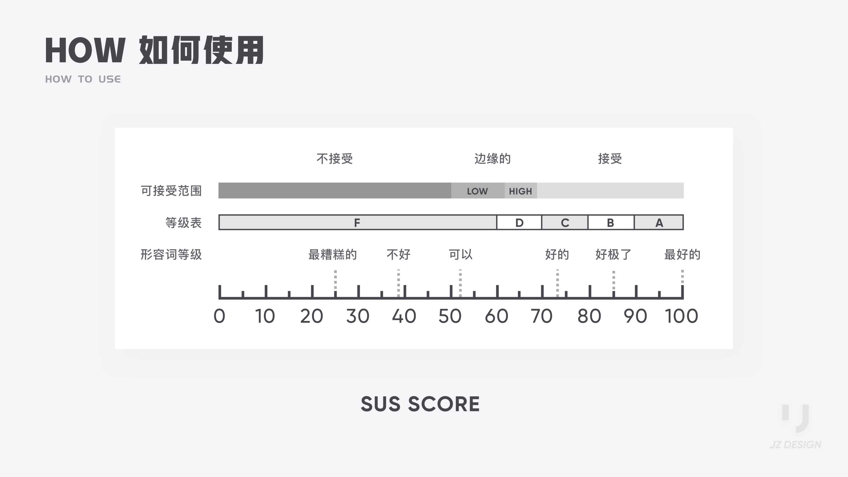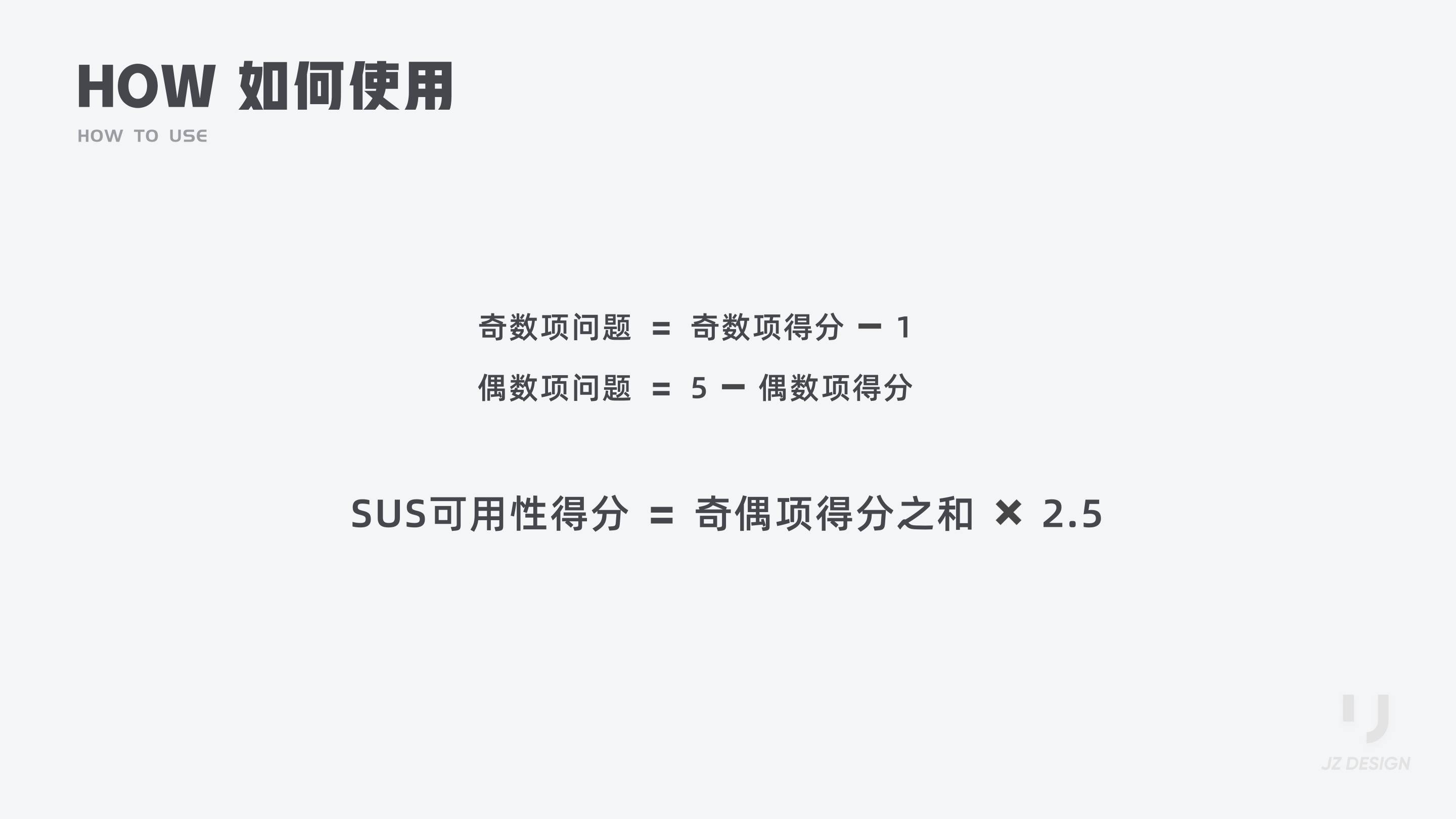3. 將所有問題最后的得分加在一起,然后乘以2.5;(每個(gè)題目的得分范圍記為0~4,最大值為40,SUS可用性得分的范圍在0~100,換算后乘以2.5)