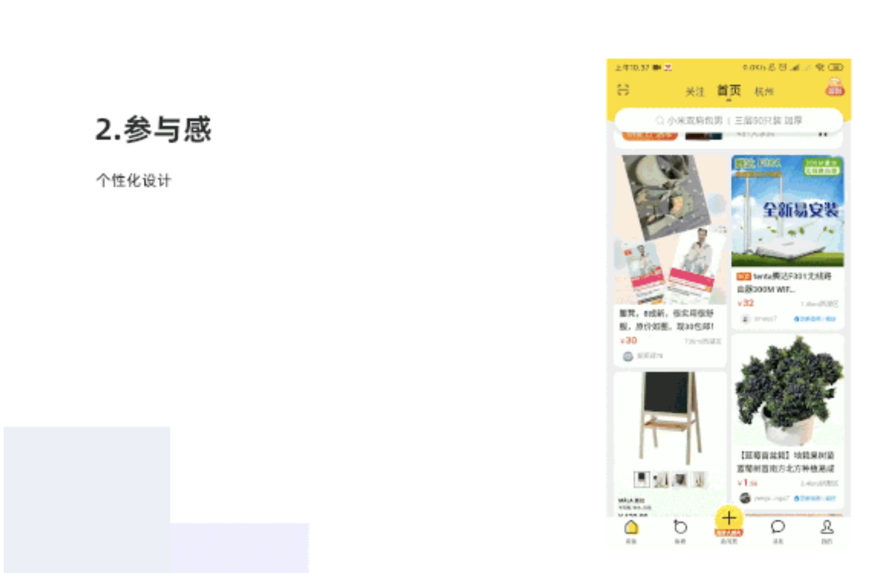 個性化設(shè)計,為用戶提供獨一無二的個性化設(shè)計,帶來個性化服務(wù),滿足用戶對閑置產(chǎn)品的需求,也同時滿足用戶發(fā)布閑置同類商品可參考的需求。當(dāng)用戶想購買閑置植物盆栽比較多時,首頁就會出現(xiàn)推薦的盆栽商品。