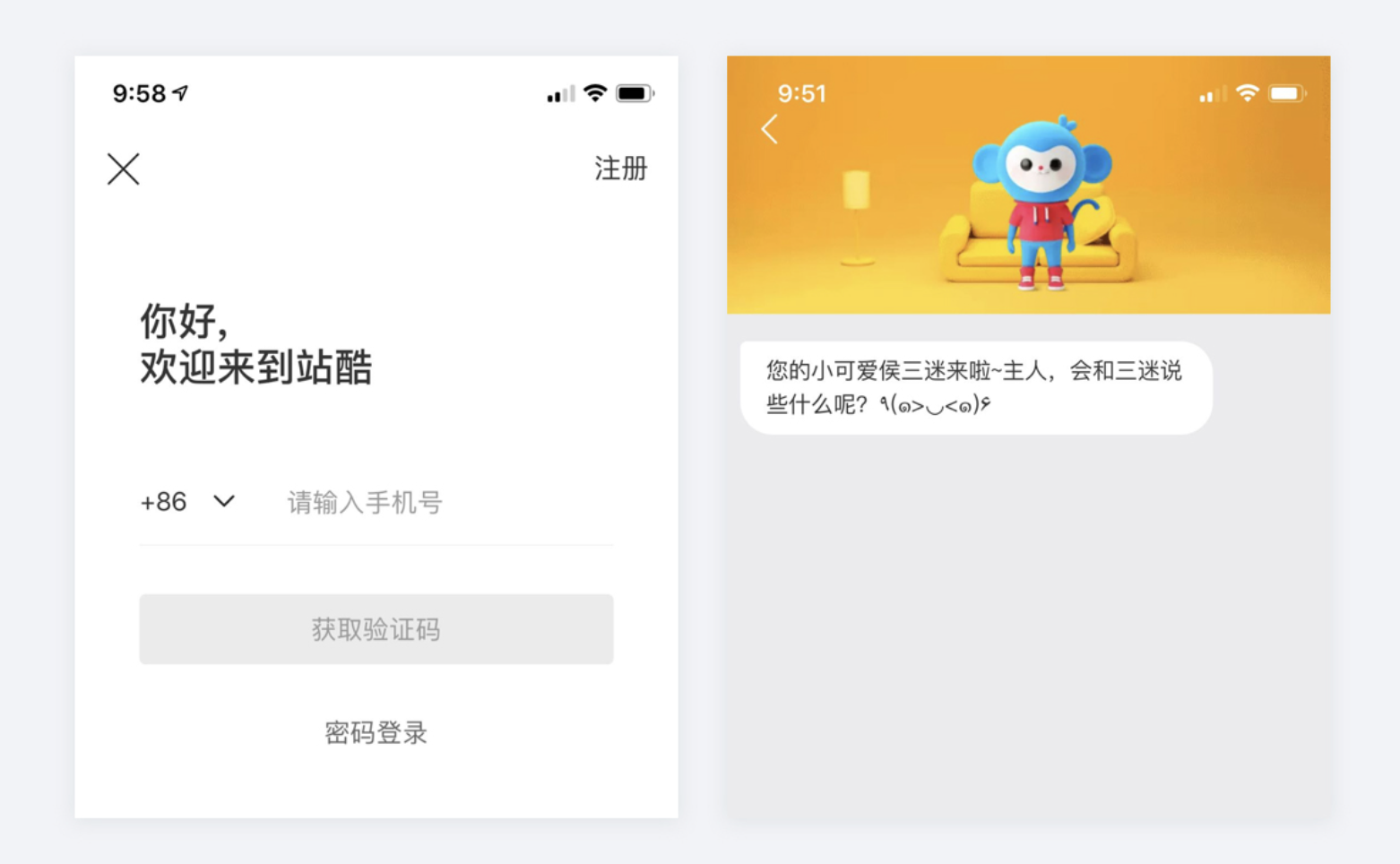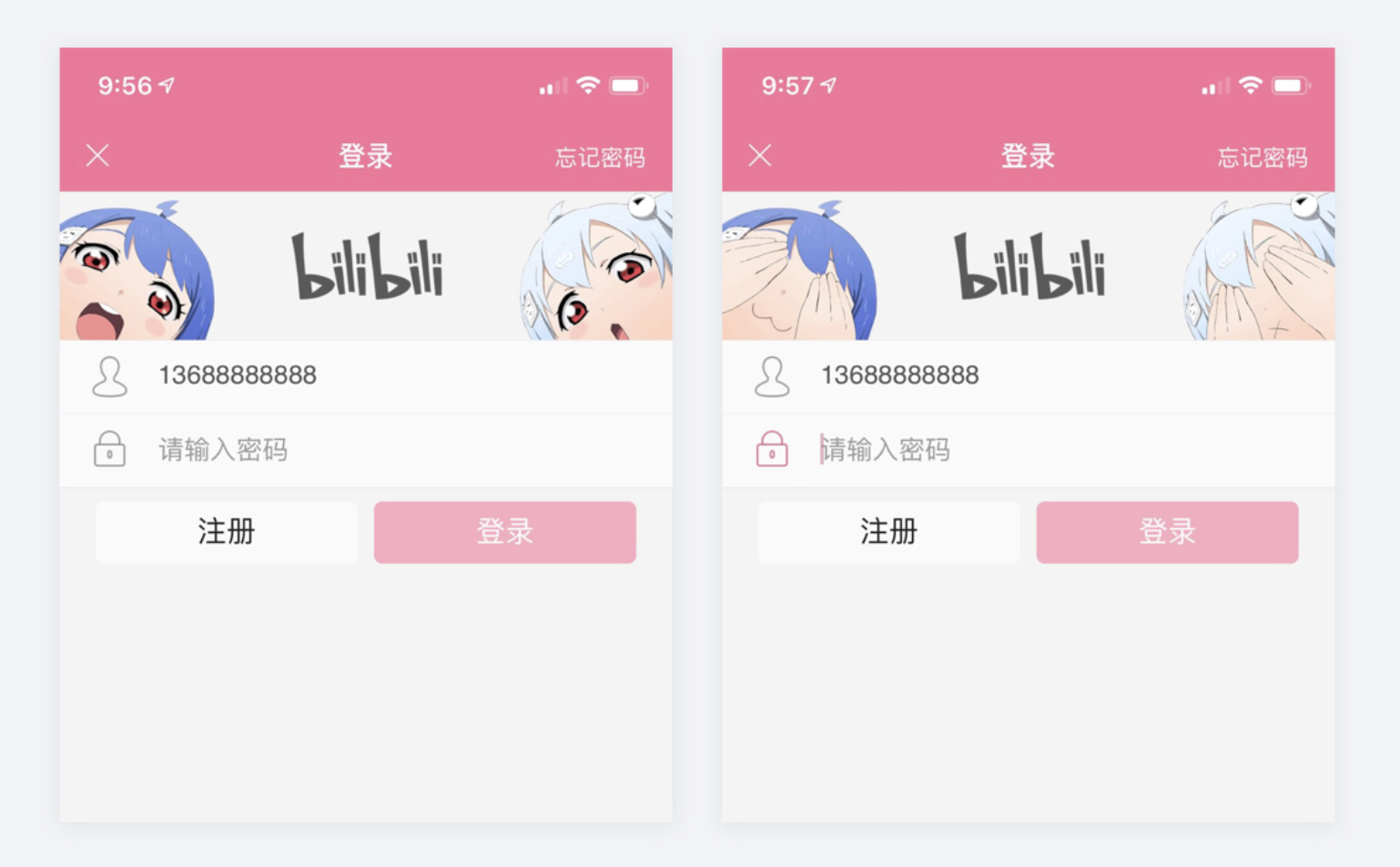 - 有趣的擬人化動作設(shè)計(jì):產(chǎn)品作出擬人化互動反饋,讓用戶感到有趣,如嗶哩嗶哩 APP 登錄輸入密碼時,IP 形象 22 和 33 會把眼睛捂起來,給用戶安全感且有趣。