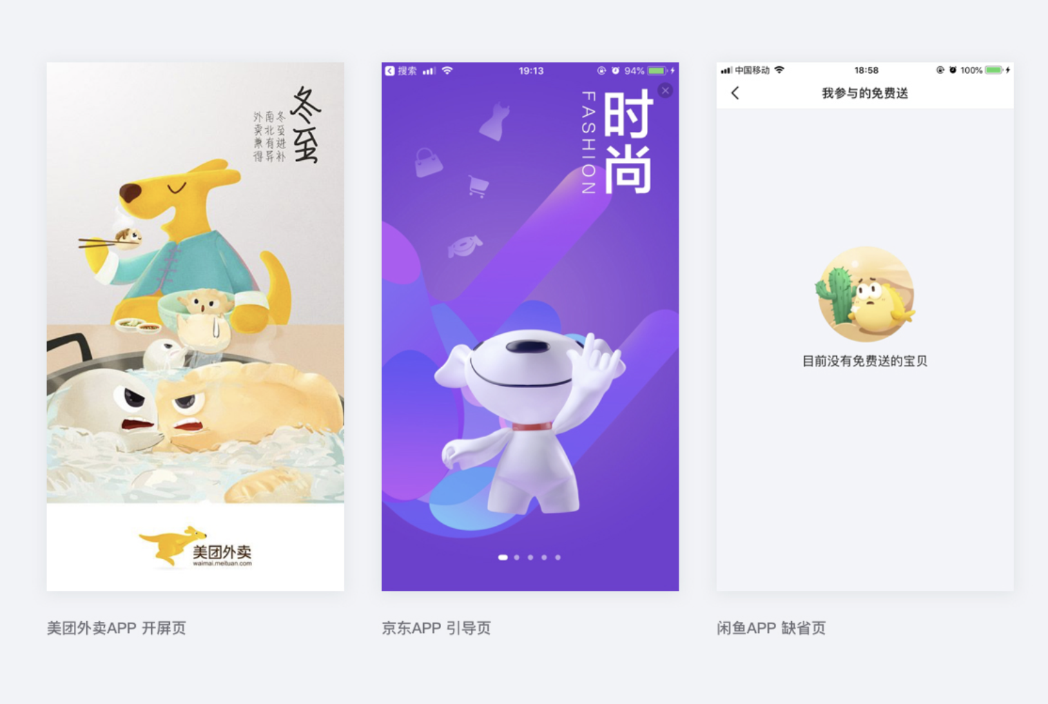 - 獨(dú)特的 IP 形象設(shè)計(jì):識別度高的 IP 形象帶給用戶親切感,拉近用戶與產(chǎn)品、企業(yè)的關(guān)系,打造品牌效應(yīng)并延展融入日常生活,如美團(tuán)外賣 APP 開屏頁、京東 APP 引導(dǎo)頁、閑魚 APP 缺省頁等展示企業(yè) IP 形象。
