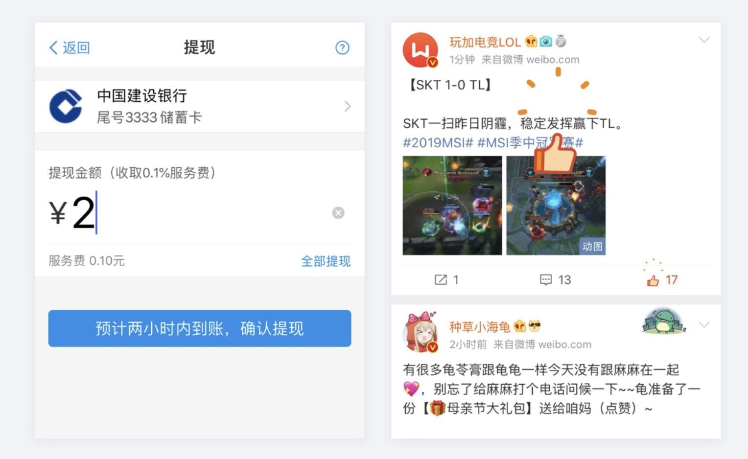 - 符合預(yù)期與超出預(yù)期的設(shè)計(jì):交互設(shè)計(jì)遵循操作前可預(yù)知、操作中有反饋、操作后可撤銷原則,符合用戶預(yù)期并增加超出預(yù)期反饋,如支付寶 APP 提現(xiàn)預(yù)先告知到賬時間,微博 APP 點(diǎn)贊彈出點(diǎn)贊圖標(biāo)小動畫。