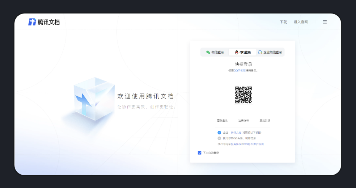 在符合業(yè)務(wù)邏輯的基礎(chǔ)上,體驗設(shè)計能優(yōu)化 B 端產(chǎn)品復(fù)雜的流程,將復(fù)雜的迷宮簡化成一條直線,讓用戶操作界面時感到暢通舒適。騰訊文檔的登錄頁沒有讓用戶輸入一連串的賬號和密碼,而是采用二維碼方式,用戶掃碼即可登錄,快捷又方便,大大簡化了登錄流程。