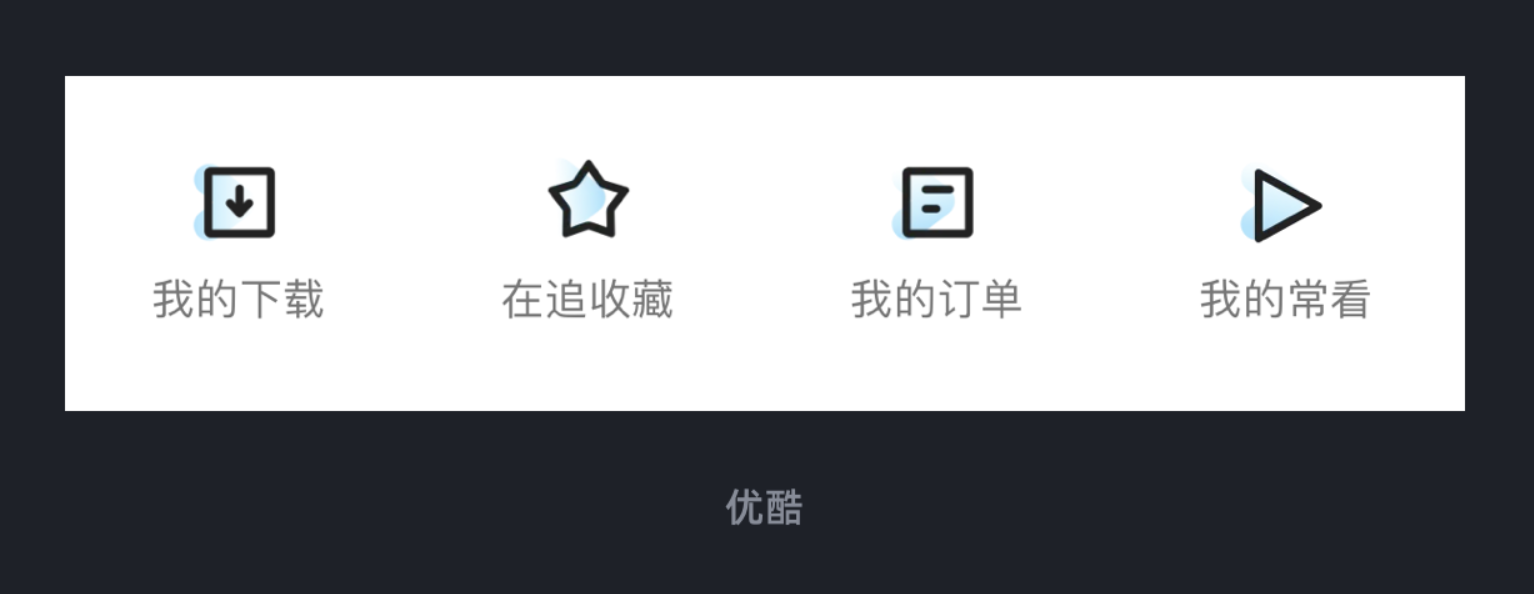 比如優(yōu)酷個人中心的圖標(biāo) ——“我的下載”“我的訂單” 這些功能按鈕,都采用簡潔的線性風(fēng)格,但在圖標(biāo)的底層悄悄疊加了優(yōu)酷的品牌圖形元素。這種 “線性 + 品牌點綴” 的設(shè)計,既保持了界面的清爽感,又讓圖標(biāo)跳出了 “千篇一律” 的困境,用戶看到圖標(biāo)時,會下意識聯(lián)想到 “這是優(yōu)酷的設(shè)計”,慢慢形成記憶點。