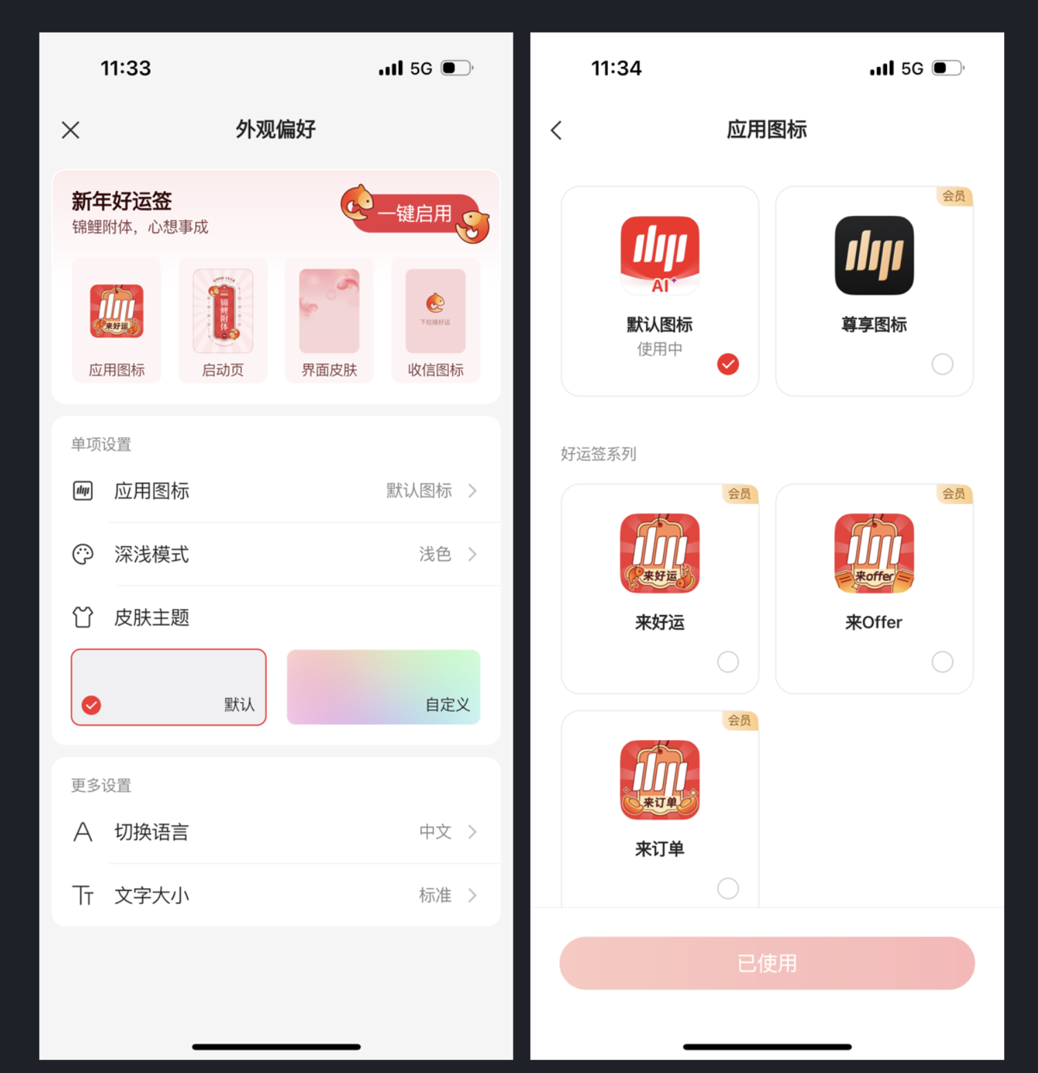 更貼心的是,這些設(shè)置都支持 “單項調(diào)整”—— 比如用戶只想換圖標(biāo),不用連帶改皮膚;想調(diào)文字大小,也不用重新設(shè)置模式。這種 “精細(xì)化自定義”,讓用戶感覺 “這個 APP 是為我量身定制的”,不僅降低了審美抵觸,還悄悄提升了用戶對產(chǎn)品的好感度。