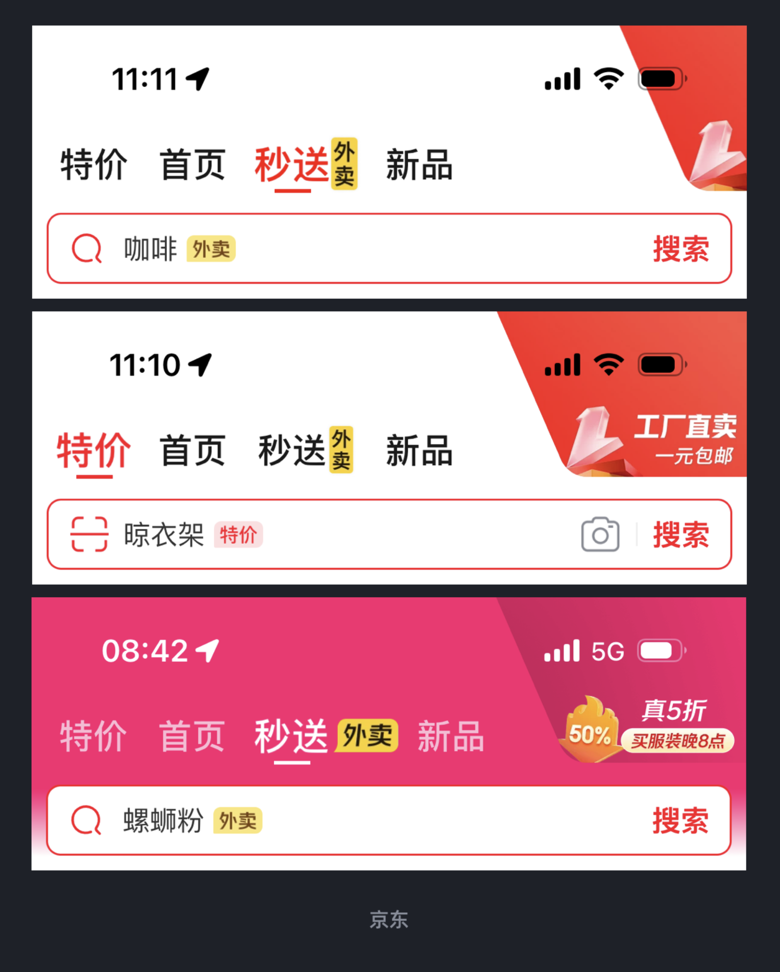 之前京東外賣還沒加入 “秒送” 欄目時,導(dǎo)航欄的布局有些失衡:左側(cè)是 “特價”“首頁” 等功能入口,右側(cè)只有搜索框,中間和右側(cè)有不少空白。后來京東把外賣業(yè)務(wù)納入 “秒送” 欄目,在導(dǎo)航欄右側(cè)加了一個 “外賣” 營銷入口 —— 這個小小的改動,不僅讓導(dǎo)航欄左右布局更對稱,還充分利用了之前的空白區(qū)域,拓展了營銷接口。用戶點進(jìn) “外賣” 就能直接下單,不用再從首頁層層尋找,既提升了轉(zhuǎn)化,又讓界面更規(guī)整。