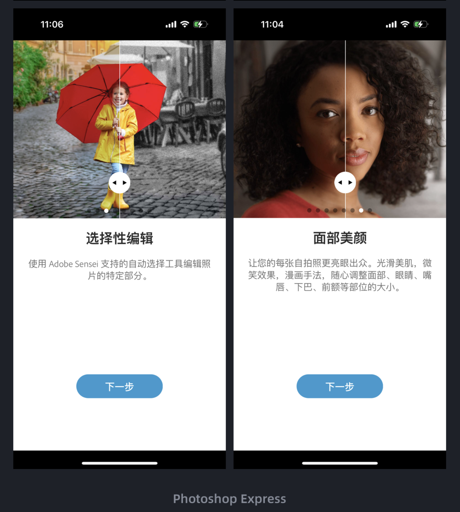 很多產(chǎn)品的引導(dǎo)頁、功能介紹,都喜歡用 “靜態(tài)圖文”,用戶看了容易忘,也感受不到功能的實際價值。但 Photoshop Express 的引導(dǎo)頁設(shè)計,卻用 “互動” 讓功能優(yōu)勢變得直觀 —— 用戶不用 “看說明”,而是 “親身體驗”。