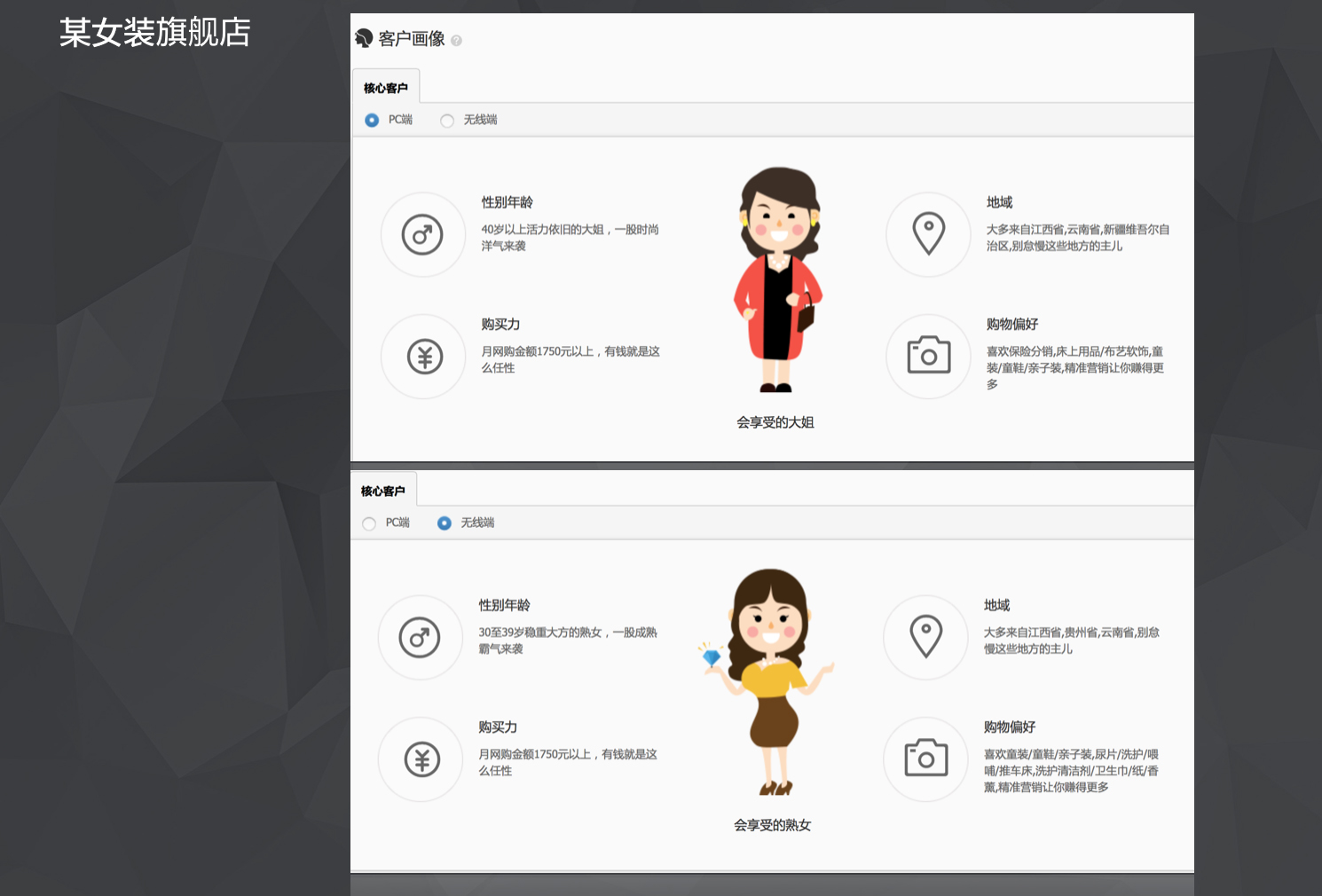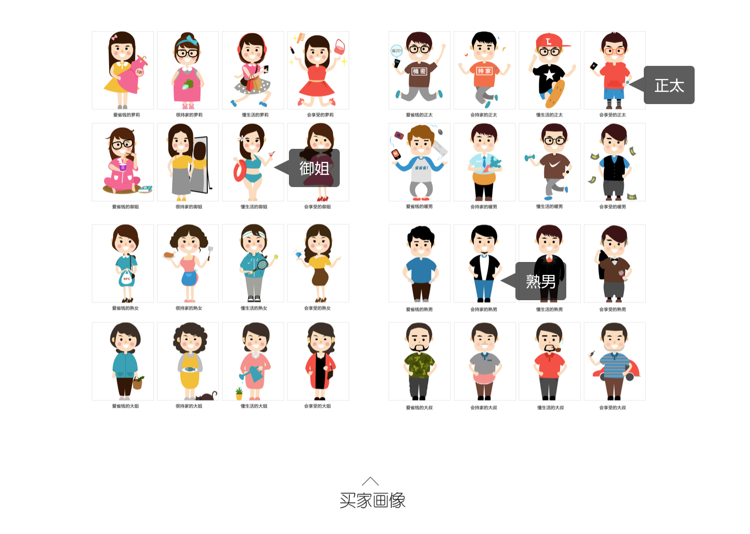 通過購買力,性別,年齡,偏好4個緯度來將訪客劃分為不同的類型,用手繪的形式來代替文案,讓用戶在短時間內(nèi)更容易的了解到到店訪客的情況。