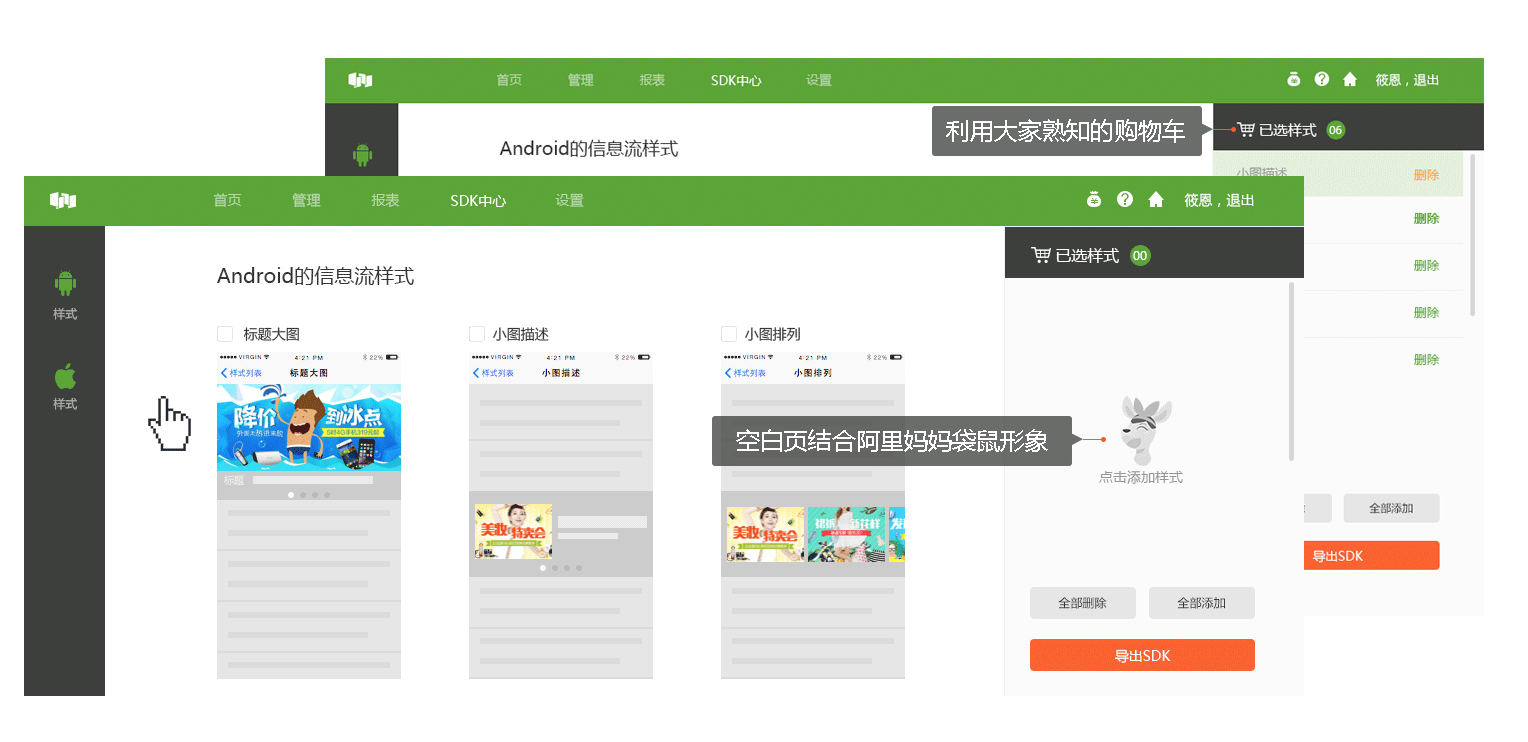 在新品介紹中加入了阿里媽媽袋鼠的品牌形象,一方面做到了,品牌的滲透。阿里媽媽袋鼠吉祥物在PC產(chǎn)品端落地的,另一方面可以通過帶有表情的卡通形象,傳達給用戶相關(guān)的信息。