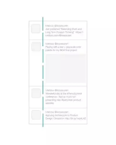 從產(chǎn)品設(shè)計(jì)的角度上來(lái)看,Twitter 的時(shí)間線設(shè)計(jì)就是一個(gè)很好的案例,左側(cè)的頭像和右側(cè)的推文共同塑造出縫隙中軸線的感覺(jué)。
