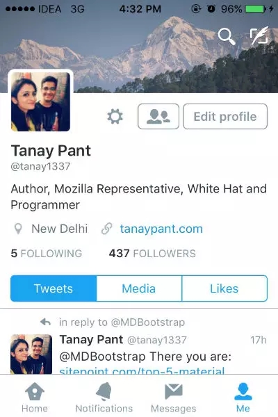 案例學(xué)習(xí):Twitter上的切換鍵被放在屏幕的端。這幫助用戶更加快速的觸碰相關(guān)鍵如主頁(Home)、通知(Notifications)、消息(Messages)、我(Me)以進(jìn)入軟件的各個(gè)部分。他們曾經(jīng)將按鍵放在了最頂端,然而這增加了大屏用戶使用難度。