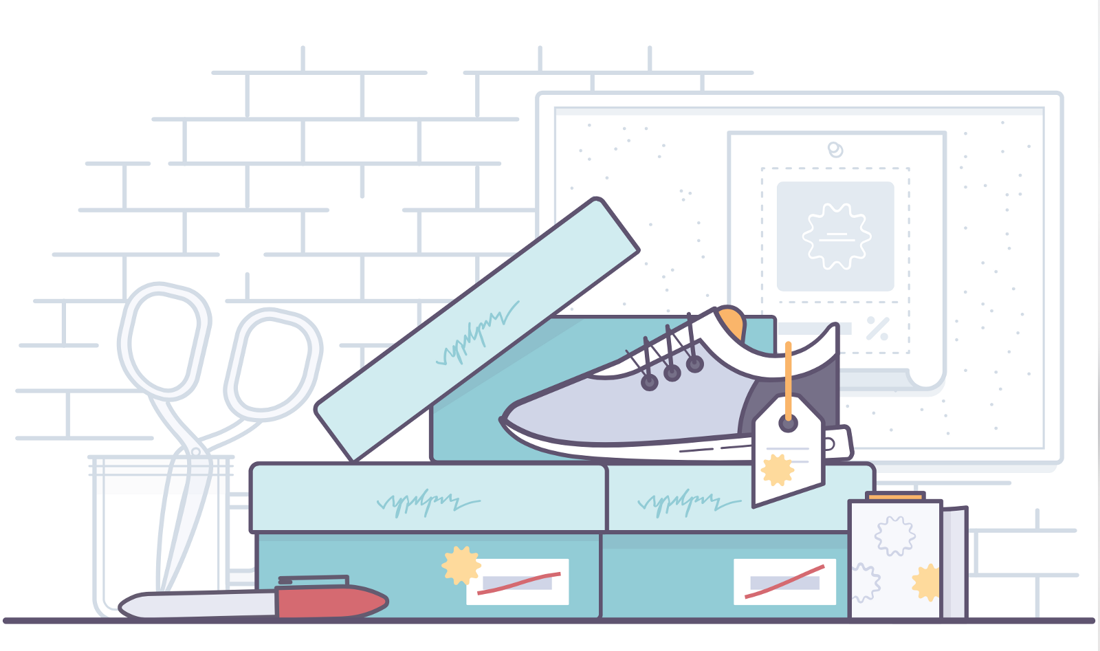 這個(gè)元素在線上和線下有相似之處。盡管我不認(rèn)為它是一類比喻,但在產(chǎn)品設(shè)計(jì)中我還是將它單獨(dú)拿出來(lái)說(shuō)。比喻常用來(lái)展現(xiàn)觸動(dòng)人心的部分,那是一件事情或者一個(gè)行動(dòng)產(chǎn)生的積極感覺(jué)。不過(guò),對(duì)于內(nèi)容傳遞給用戶的方式,團(tuán)隊(duì)更傾向于中立的寫實(shí)表達(dá)。不必告訴用戶我們的感受如何,只需簡(jiǎn)潔傳達(dá)信息。用插畫的專業(yè)術(shù)語(yǔ)來(lái)表達(dá)則是:我們只愿意通過(guò)繪制寫實(shí)狀態(tài)下的物品,來(lái)幫助用戶理解線上的內(nèi)容。當(dāng)然,談到產(chǎn)品時(shí),我們大多是在電腦上作畫,比如,你可以繪制20多個(gè)互相連接的空狀態(tài)頁(yè)面,來(lái)表達(dá)重復(fù)性。這也是我們?cè)跒橛脩魝鬟_(dá)內(nèi)容時(shí)增加的一種類比方式。比如下圖的例子,線上電子商務(wù)可以讓用戶通過(guò)優(yōu)惠碼輸入實(shí)現(xiàn)折扣,那么線下實(shí)體銷售折扣該如何表達(dá)呢?可能是一堆貼紙和帶著折扣價(jià)格的紅色標(biāo)記。我們能借助全新懷舊風(fēng)格的插畫為用戶帶來(lái)愉悅,同時(shí)還能保持中立,只是簡(jiǎn)單清晰的表達(dá)信息。