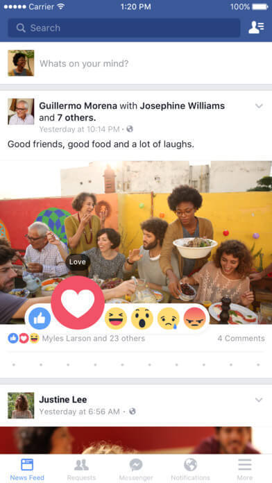 Facebook中好友的每條動(dòng)態(tài)都是以一張卡片的形式展現(xiàn)的。用戶可以很快的完成對(duì)頁(yè)面信息的讀取。你可以不斷的往下滑查看更多的好友動(dòng)態(tài)。你也可以看到多少人點(diǎn)贊,多少人評(píng)論與分享。這些功能誘導(dǎo)用戶積極參與互動(dòng),增加傳播性。