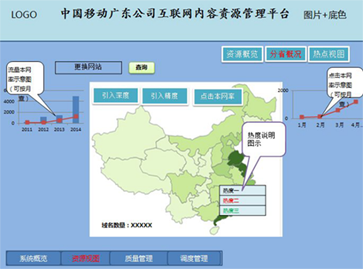 內(nèi)容管理分為兩大模塊,視頻管理和網(wǎng)頁管理。內(nèi)容管理部分,重點呈現(xiàn)全網(wǎng)TOPN熱點資源的各省的IDC引入情況、IDC服務(wù)流量、各省點擊量分布情況。