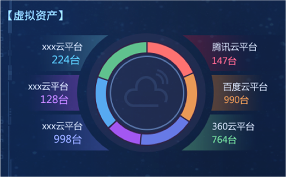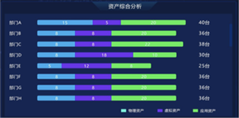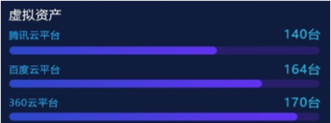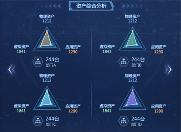 “資產(chǎn)綜合分析”模塊,以部門為單位,對企業(yè)“物理資產(chǎn)”“虛擬資產(chǎn)”“應用資產(chǎn)”數(shù)量統(tǒng)計分析,并展示各部門內(nèi)不同資產(chǎn)類型的比例關系和總量。在設計版本中,我們改變模塊內(nèi)的布局和交互方式,以雷達圖方式展示部門內(nèi)部不同資產(chǎn)類型的數(shù)量關系和總量,并通過顏色來區(qū)分不同部間的數(shù)據(jù)。內(nèi)容擴展性方面,采用左右橫向翻頁樣式,可自由設定系統(tǒng)自動翻頁切換和手動點擊切換,不僅豐富了頁面展示方式,又增加交互趣味性,數(shù)據(jù)切換過程中動效的使用也進一步增加界面的科技感和“數(shù)據(jù)之美”。