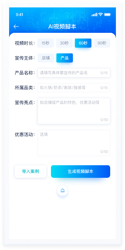 AI生成視頻腳本是用戶輸入相應(yīng)條件后,AI大模型通過系統(tǒng)算法生成視頻內(nèi)容。整體風(fēng)格較為科技感,因此在配色上使用藍(lán)色漸變及較重投影,符合產(chǎn)品屬性,能夠突出產(chǎn)品的創(chuàng)新性和先進(jìn)性。使用戶在使用過程中感受到強(qiáng)烈的視覺沖擊和沉浸感,這種體驗(yàn)有助于增強(qiáng)用戶對(duì)產(chǎn)品的興趣。