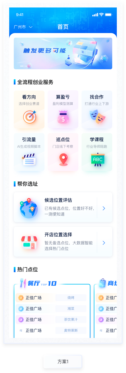 所盈利測(cè)算功能是產(chǎn)品的主要功能,通過AI對(duì)未來開店盈虧情況進(jìn)行預(yù)測(cè)評(píng)估。本次設(shè)計(jì)主要優(yōu)化該流程的交互及視覺表現(xiàn),整個(gè)流程分為“成本結(jié)構(gòu)”“收入結(jié)構(gòu)”“經(jīng)營測(cè)算”三個(gè)階段,過程填寫情況放置在頁面頂部,一步了然。已填寫使用主題色標(biāo)注,未填寫則使用置灰顏色處理,符合用戶基本感知。按鈕使用與主色相近的漸變色。